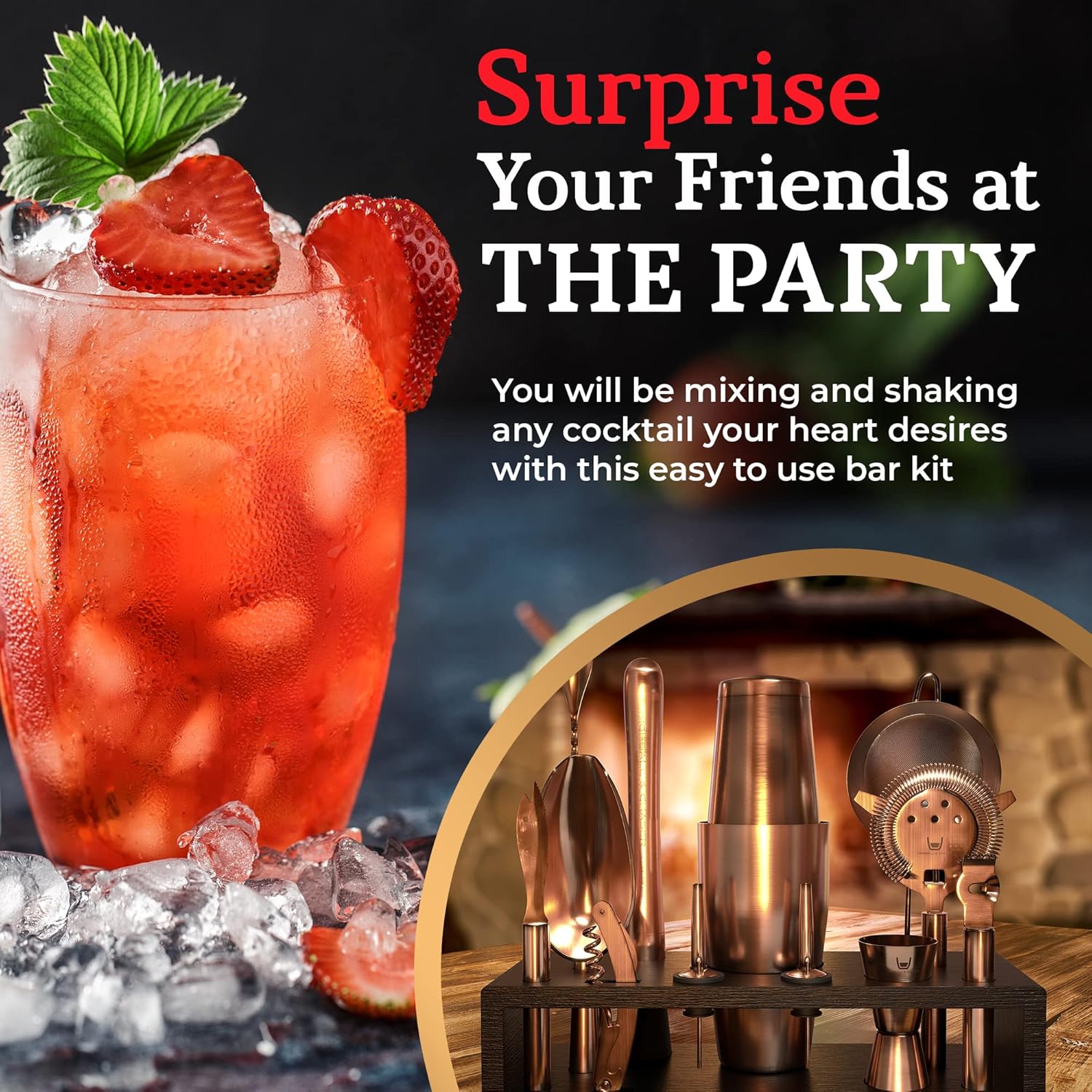 - * ✅ BEAUTIFUL BAMBOO STAND: The cocktail shaker kit comes in a convenient, beautiful, and extremely sturdy bamboo stand. The stand is made of solid bamboo over 1/2in. thick and has a beautiful clear finish that is completely food safe. The stand is12.7in. wide 3in. tall.