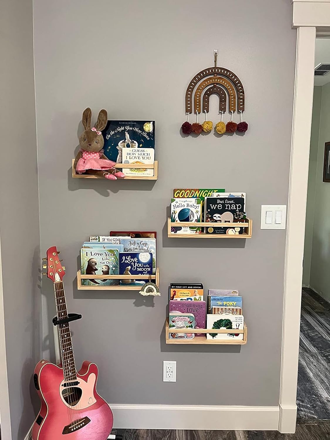 - β COMES IN SET OF 4 β Weβre offering you a durable, smart, and functional wall shelf set. When you buy this product, youβll get four well-designed shelves! This nursery room wall shelf comes in a set of four to provide enough space for your books, toys, candles, and other small items at home.