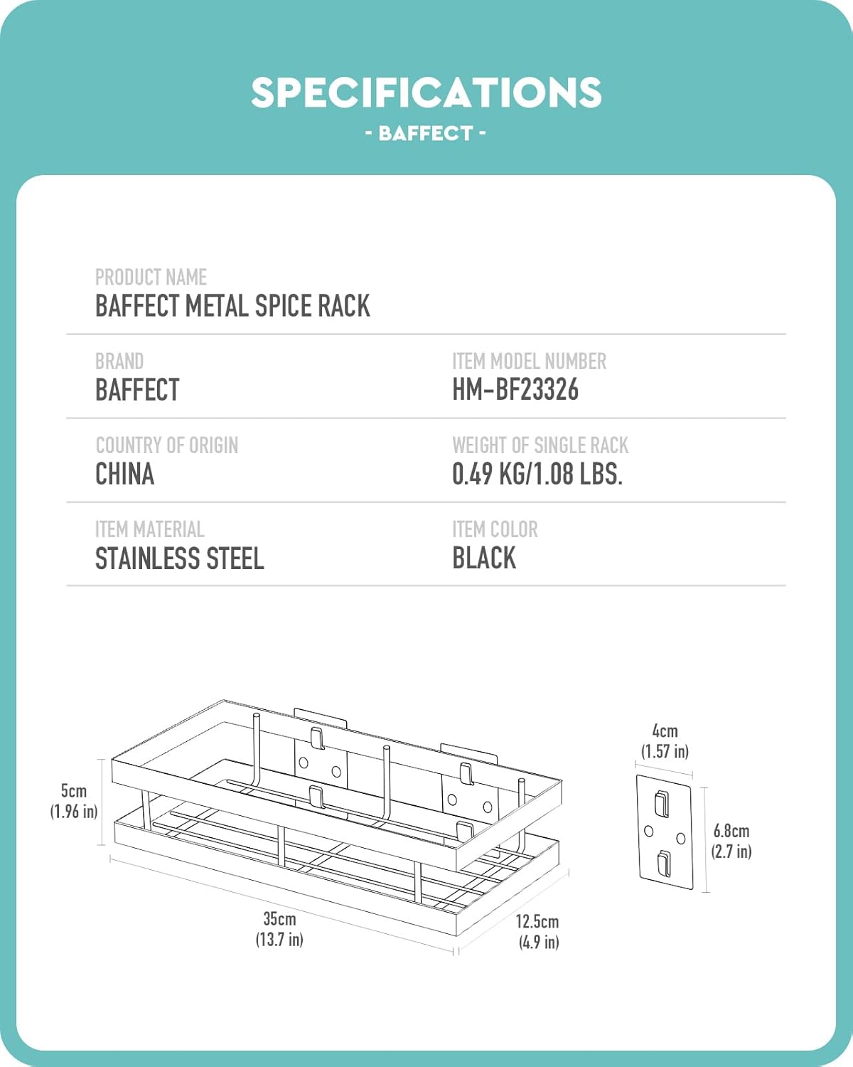 - [SPECIFICATION] There are 2 shelves in the package. Dimension of each spice rack is 13.7(L) x 4.9(W) x 2.7(H) inches, the weight is 1.98lbs.