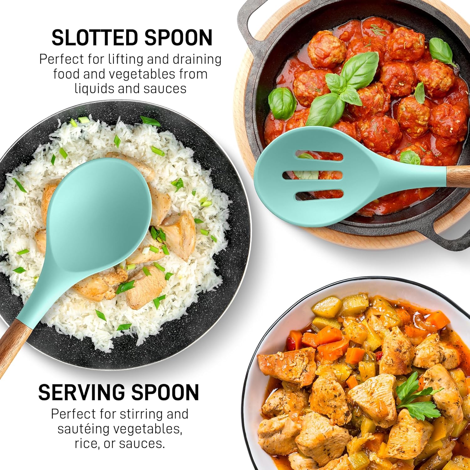 Zulay Kitchen Non-Stick Cooking Utensils Set with Authentic Acacia Wood Handles – 5-Piece Durable & Stylish Silicone Kitchen Utensils Set – Heat Resistant to 464°F – Aqua
