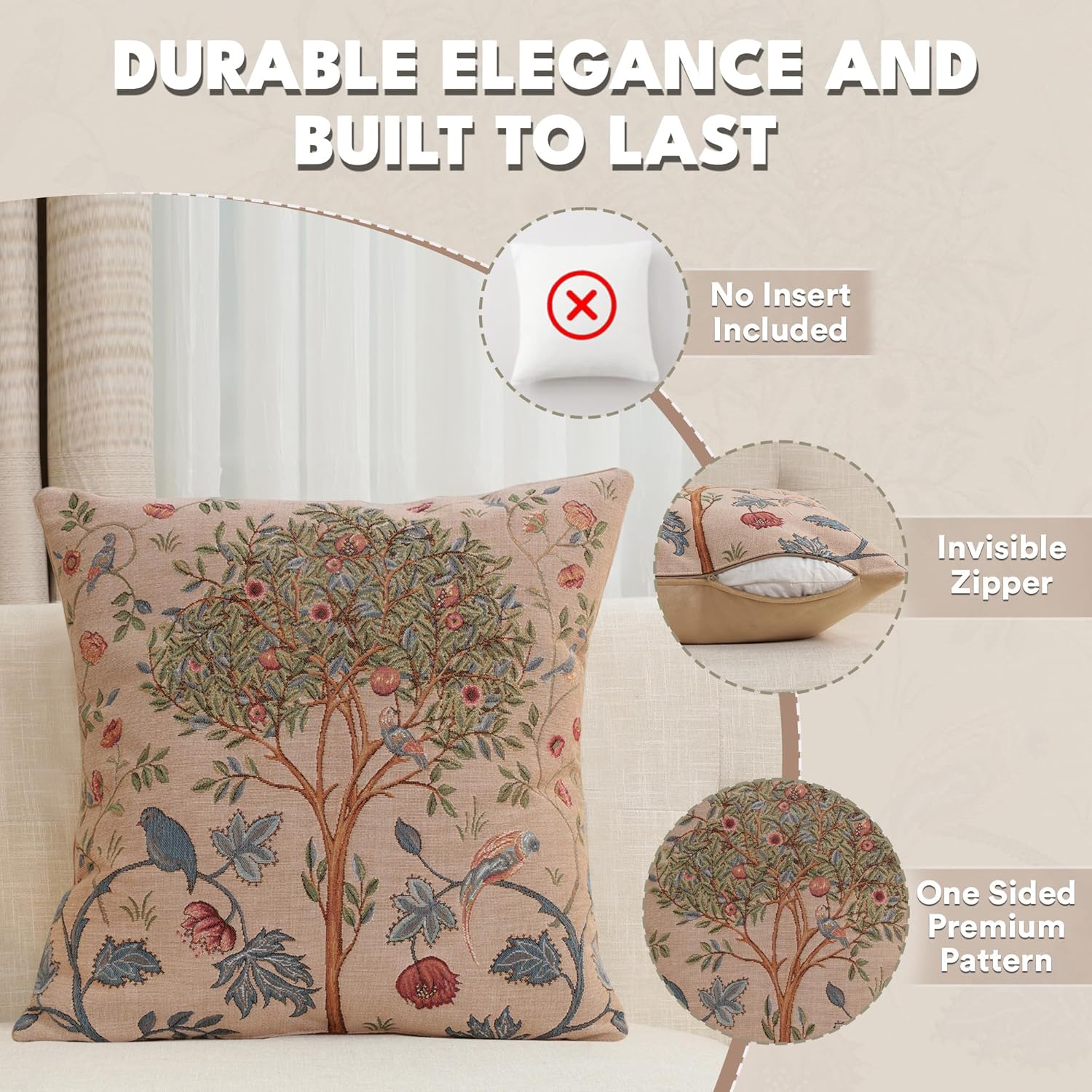- Timeless Durability: Elevate your decor with our skin-friendly William Morris pillow covers 19βX19β, where quality and style come together. A sturdy hidden zipper ensures easy pillow insertion/removal, while the overlock stitches prevent seam ripping. Unlike thin printed cushion covers prone to tearing, our decorative pillows for couch with a super-soft backside are crafted with thick premium threads for long-lasting quality. THE PACKAGE INCLUDES A SINGLE TAPESTRY PILLOW COVER WITHOUT AN INSERT