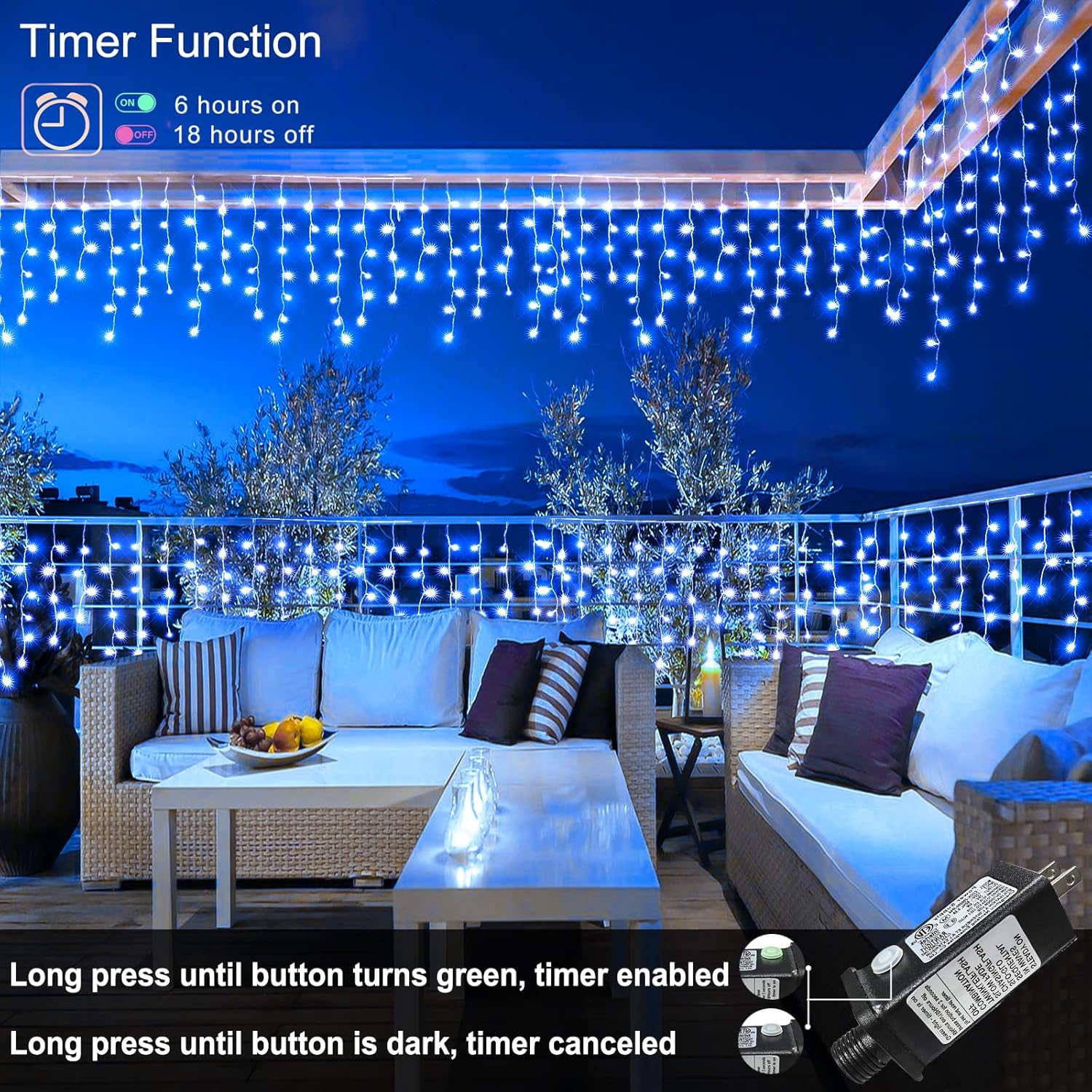 - Memory and Timer Function: The icicle Christmas lights outdoor could recover from the previous setting mode when you restart, no need to reset the mode every time. Press and hold the button on the adapter for 3 seconds until the green light on, then the timer function start, 6 hours on 18 hours off. This smart and convenient outdoor Christmas lights for house is the best choice for your holiday decoration.