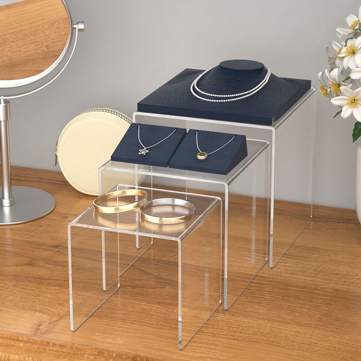 - PACKAGE INCLUDES- 2 set of 3-tier acrylic display risers, 6 packs in total. 3x3x3, 4x4x4 and 5x5x5 inch cubic acrylic riser shelf is also great for showing jewelry, makeup, perfume and watch etc. You will like the multipack with various sizes, which makes the display more interesting to look at and the favorite items are easier to access.