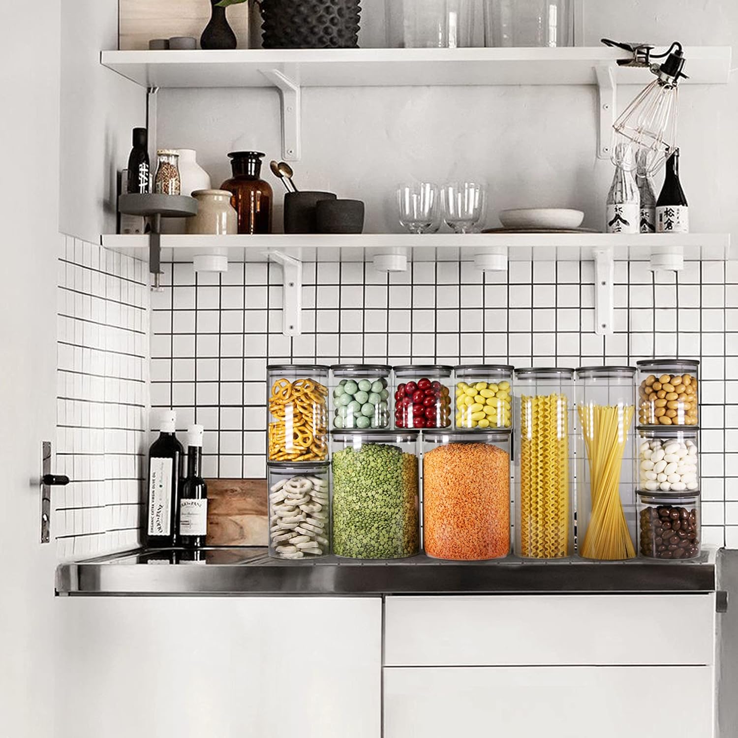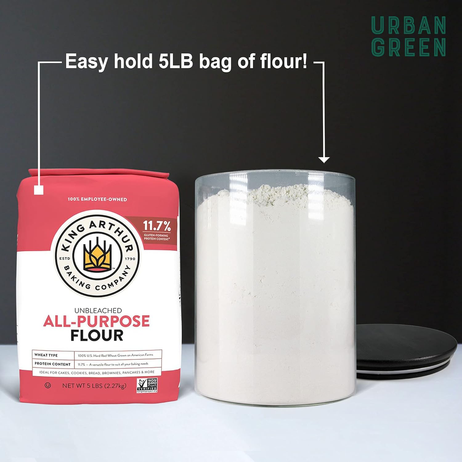 - โ 2021 NEW STYLISH BLACK LID: Looking for black and white, cool and stylish home deco? These Urban Green glass food storage canister sets with black lids are perfect for contemporary pantry design. We carefully selected 5 different sizes from 6oz to 100oz that can store any dry food, such as pasta, beans, nuts, cookies, spice or flour. Try our black lids glass jars for a new modern pantry organization.