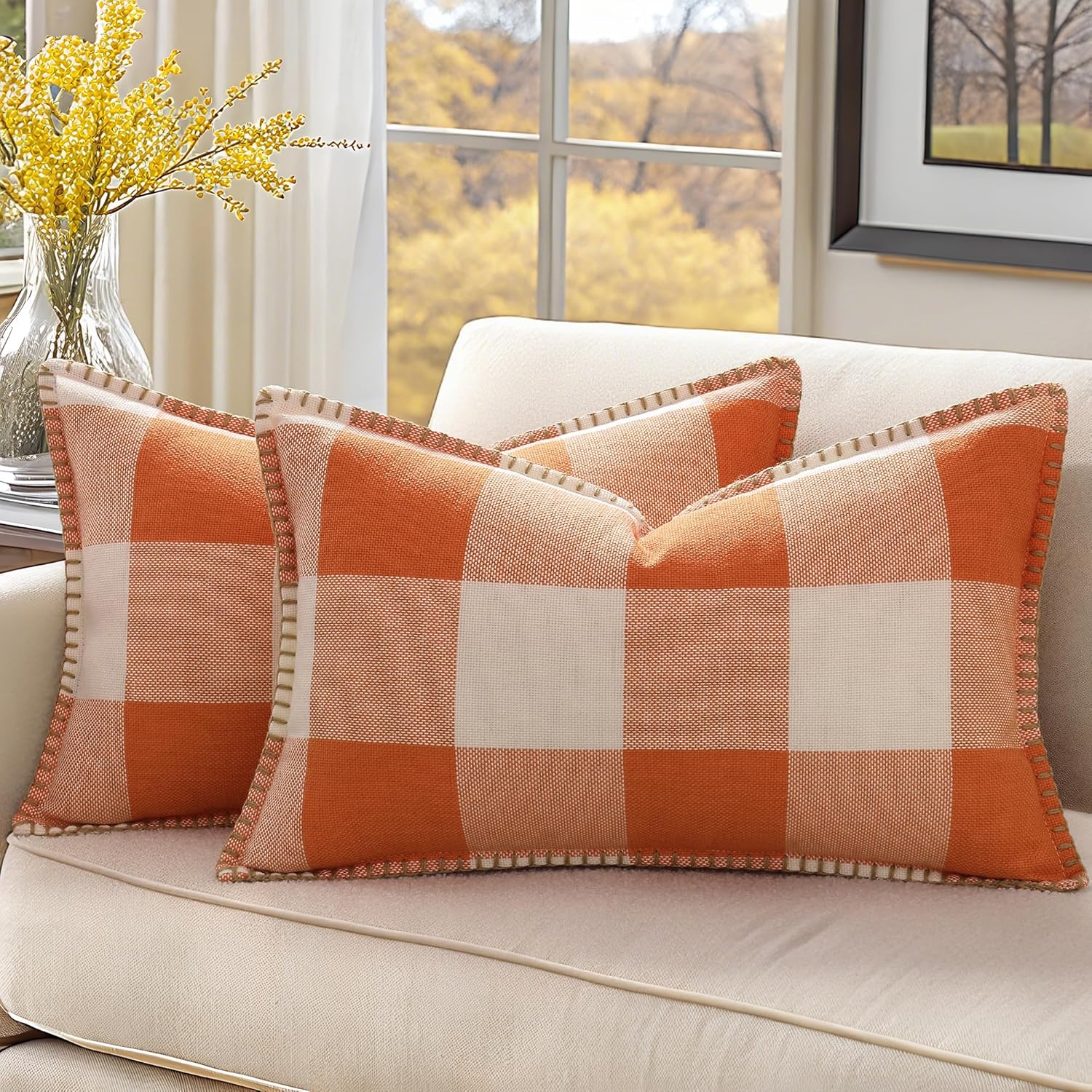 decorUhome Fall Orange and White Decorative Throw Pillow Covers 12x20 Set of 2, Lumbar Buffalo Plaid Check Farmhouse Cushion Covers with Stitched Edge for Autumn Harvest Couch Sofa Bed Home Decor