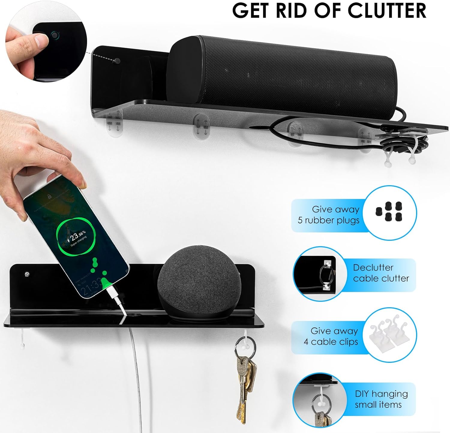 - DURABLE & STRONG: The black acrylic shelves are made of high-quality acrylic, exquisite workmanship, durable and strong enough to hold up to 7 pounds. Convenient and non-damaging storage for items such as cosmetics, smart speakers, baby monitors, action figures, and more.