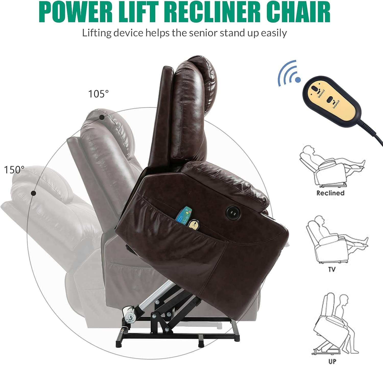 VIVIJASON Power Lift Chair Electric Recliner for Elderly Heated Vibration Massage Faux Leather Recliner Chair with 2 Remote Controls, Cup Holders, Side Pockets & USB Ports for Living Room (Brown)