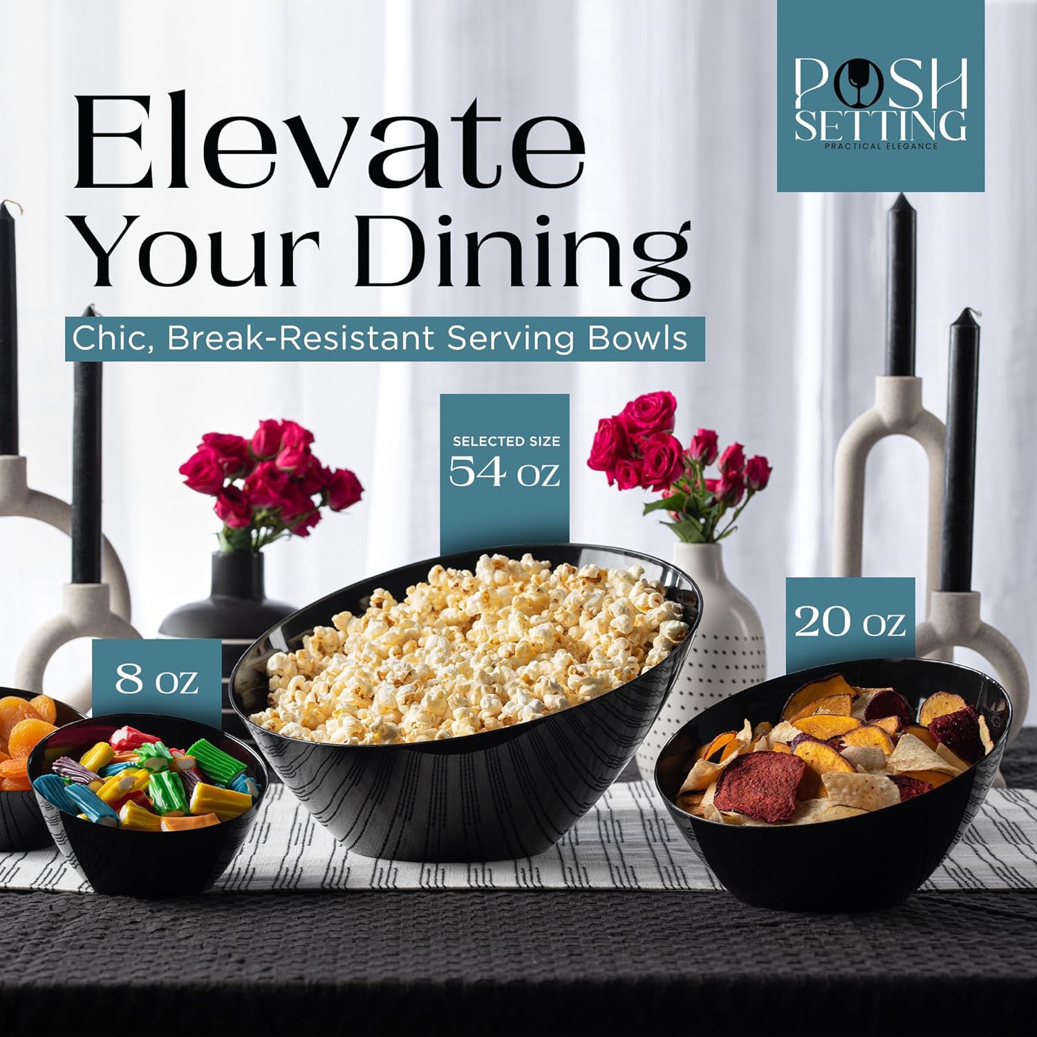 Posh Setting Black Plastic Serving Bowls Disposable - Angled Bowls - Angled Candy Bowl - Plastic Snacks & Chip Bowls for Parties - Black, Gold & Clear, White Serving Dishes, 54 OZ, 5 Pack