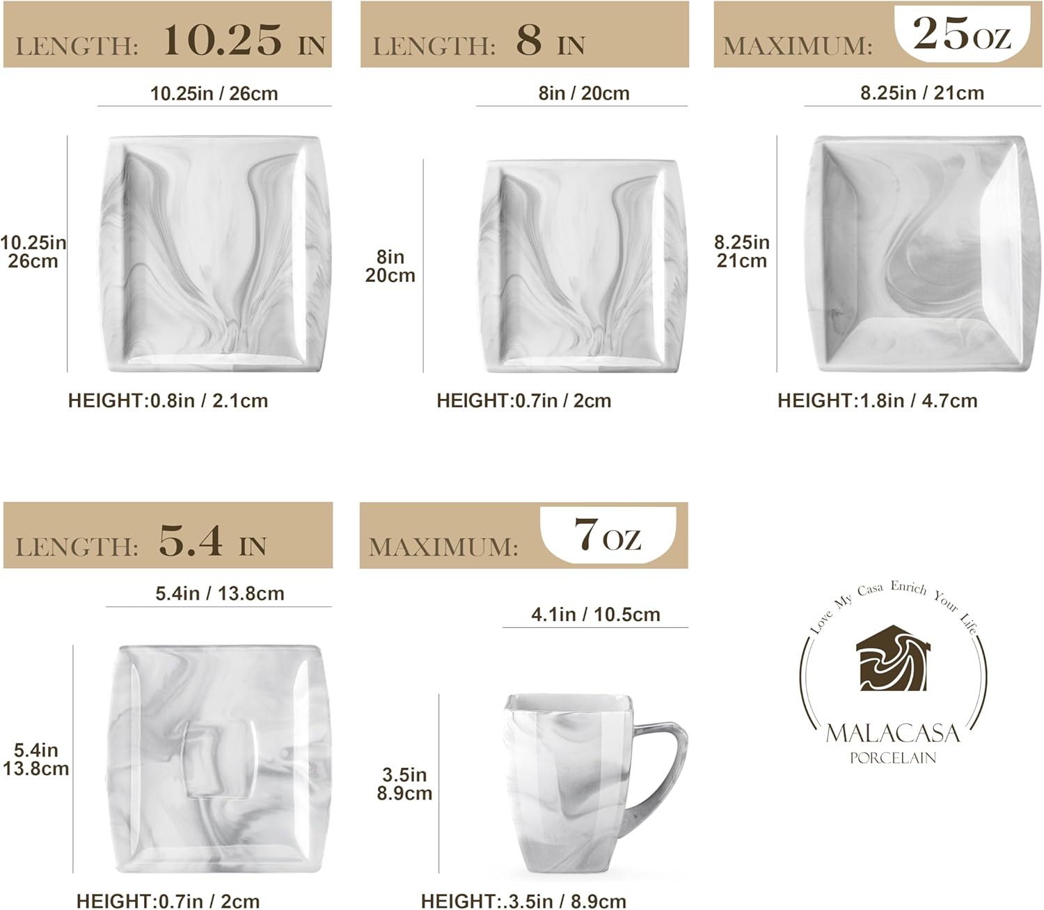 - Elevate Your Dining Experience -- MALACASA dinnerware sets for 6 include 10.25 dinner plates, 8'' dessert plates, 25 OZ soup plates, 7 OZ coffee mugs (Recommend 5 OZ), and 5.4'' saucers. Marble plates and bowls sets add a visual interest and offer a stylish and elegant look for dining table.