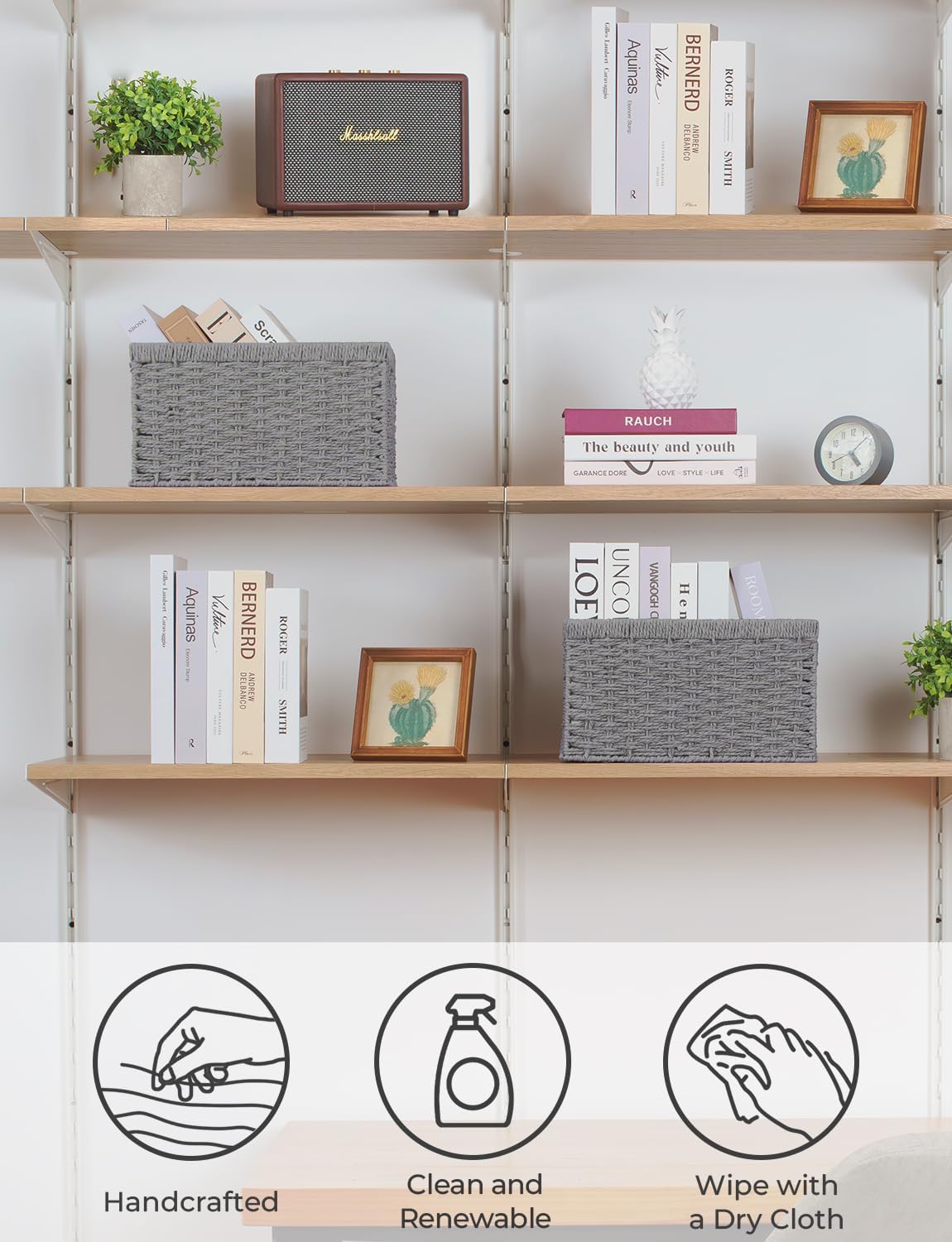 StorageWorks Round Paper Rope Storage Baskets, Rectangular Wicker Baskets with Built-in Handles, Gray, 2-Pack