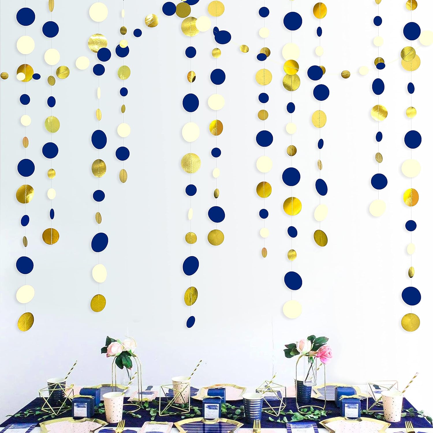 46 Ft Navy Blue and Gold Circle Dots Garland Royal Blue Hanging Paper Polka Dot Streamer for Birthday Wedding Bridal Baby Shower Graduations Nautical Ahoy Achor Pirate Theme Party Decorations Supplies