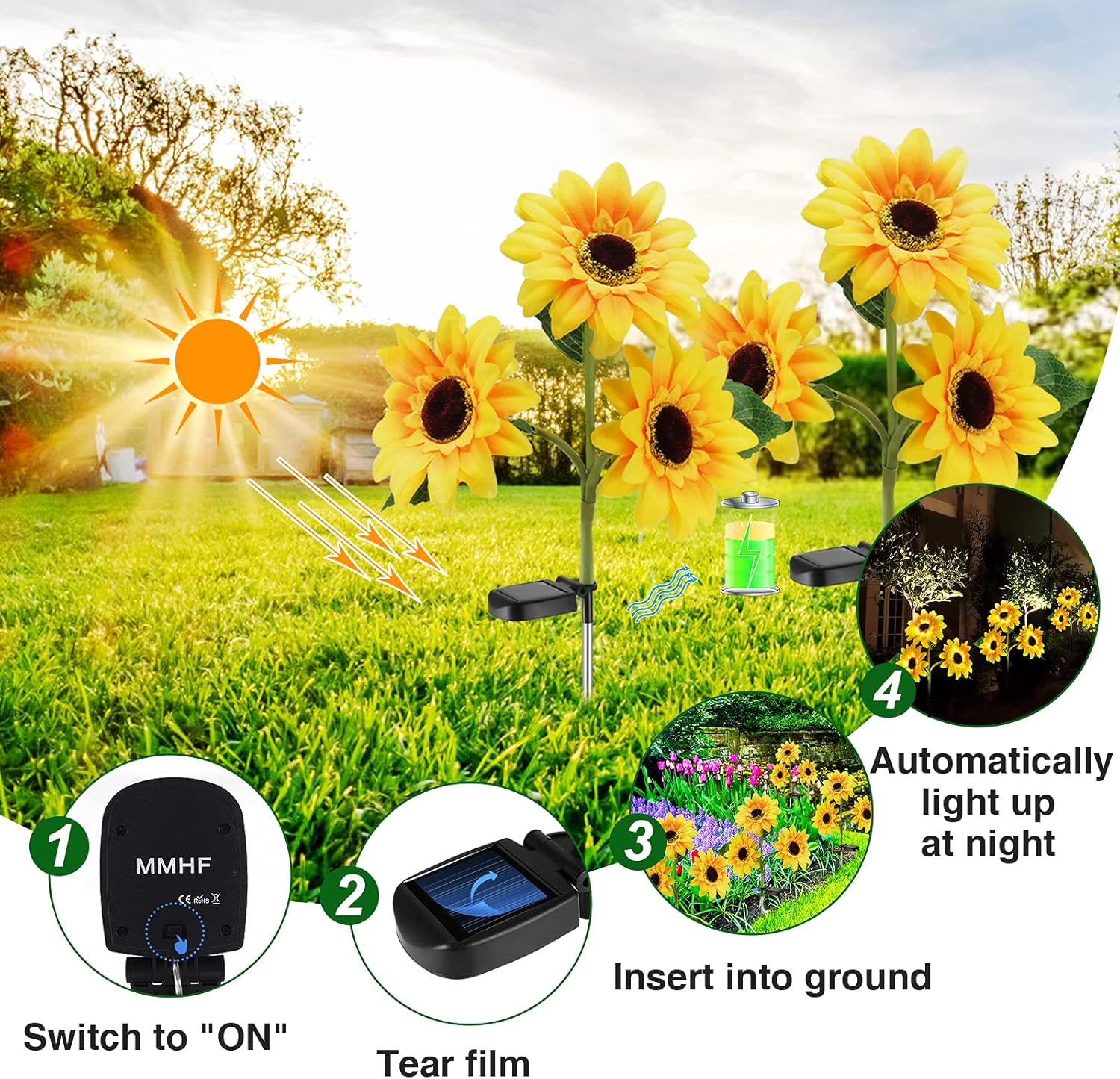 - 【Brightness & Beautiful】3 in 1 solar decorative sunflower light, 24 LED bulbs will turn on automatically at night! MMHF solar sunflower lights outdoor is beautiful enough to create a romantic atmosphere. Make your garden unique!