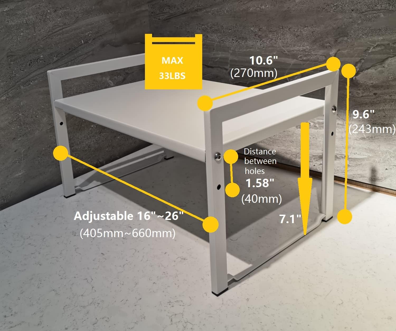 - Versatile Space-Saving Design: This expandable counter shelf adjusts from 16-26 inches (L), 10.6 inches (D), 9.6 inches (H), with a height of 7.1 inches under the shelf, making it perfect for organizing various spaces like kitchens, offices, bedrooms, and more