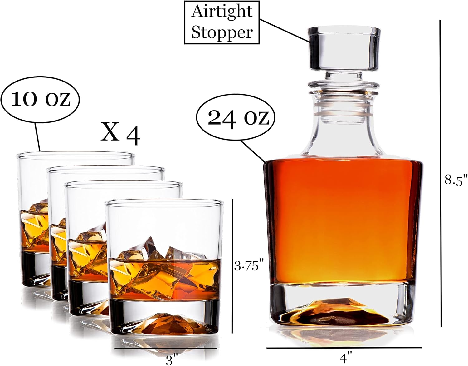 - π To make this experience even more unique and splendid, pour your whiskey into where it belongs: Our exquisite wine decanter features thick and luminous Italian-crafted glass along with a glass geometric Airtight stopper. Dimensions Decanter 24 oz 8.5" x 4" - Glasses 10 oz - 3.75 x 3"