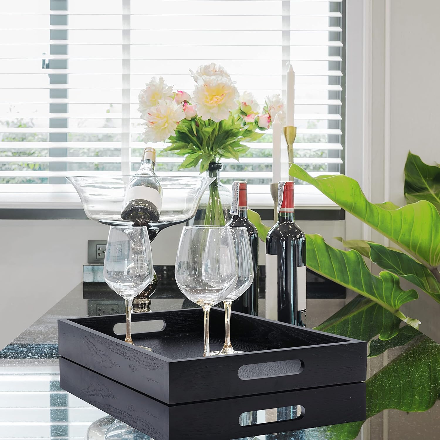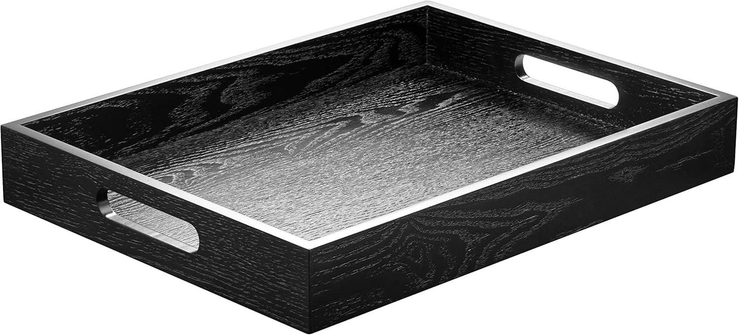 Wood Serving Tray with Handles, Home Decorative Wooden Rectangle Ottoman Decor Platter Vanity Tray for Breakfast Dinner Drinks Kitchen Dining Living Bathroom Restaurants Black