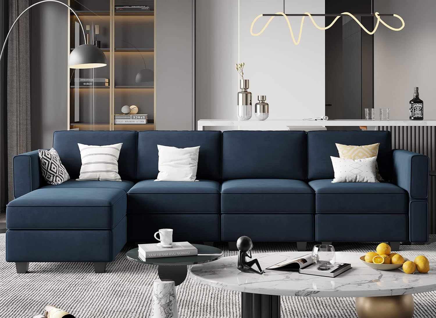 - Combination of Comfort and Artistry: The modular sectional sofa appeals to minimalist elegance with a crisp design and broad double lines accented with French piping details and velvet fabric. Dense foam padding and a pocket coil spring system in the cushions offer a luxe seating experience to you.
