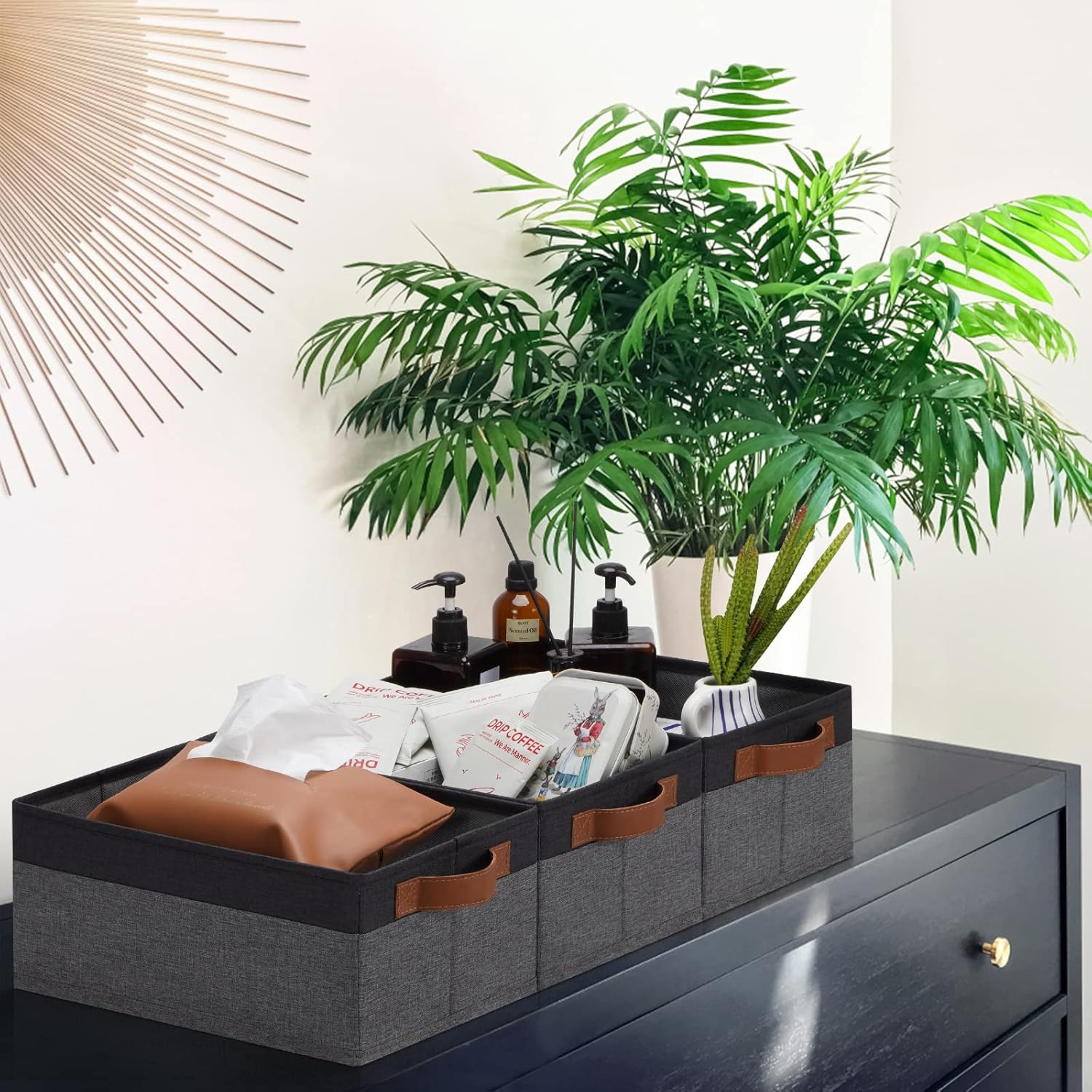 - 👍【QUALITY MATERIAL】Storage baskets for shelves are made of high-quality cationic fabric and polyester cotton fabric, and the inner layer is made of non-woven fabric, which is odorless, long-lasting and strong. Classic faux leather handles that adds a comfortable touch and provides a strong and comfort grip to pull and move. Fabric storage bin is easy to clean, just wipe with a damp sponge or cloth