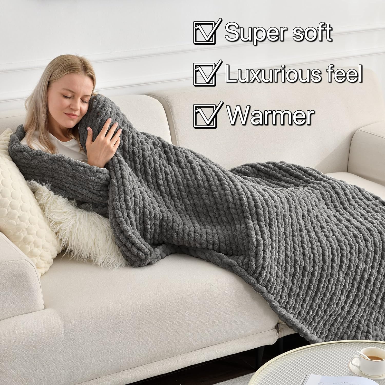 - 【 As soft as a cloud 】 - The newly upgraded chenille yarn has a touch as soft as a cloud, and a slight sheen that brings out a luxurious feel. Our blankets made of chenille yarn carry the same perfect amount of weight as those made of Merino wool do, and give you the sense of security that you need.
