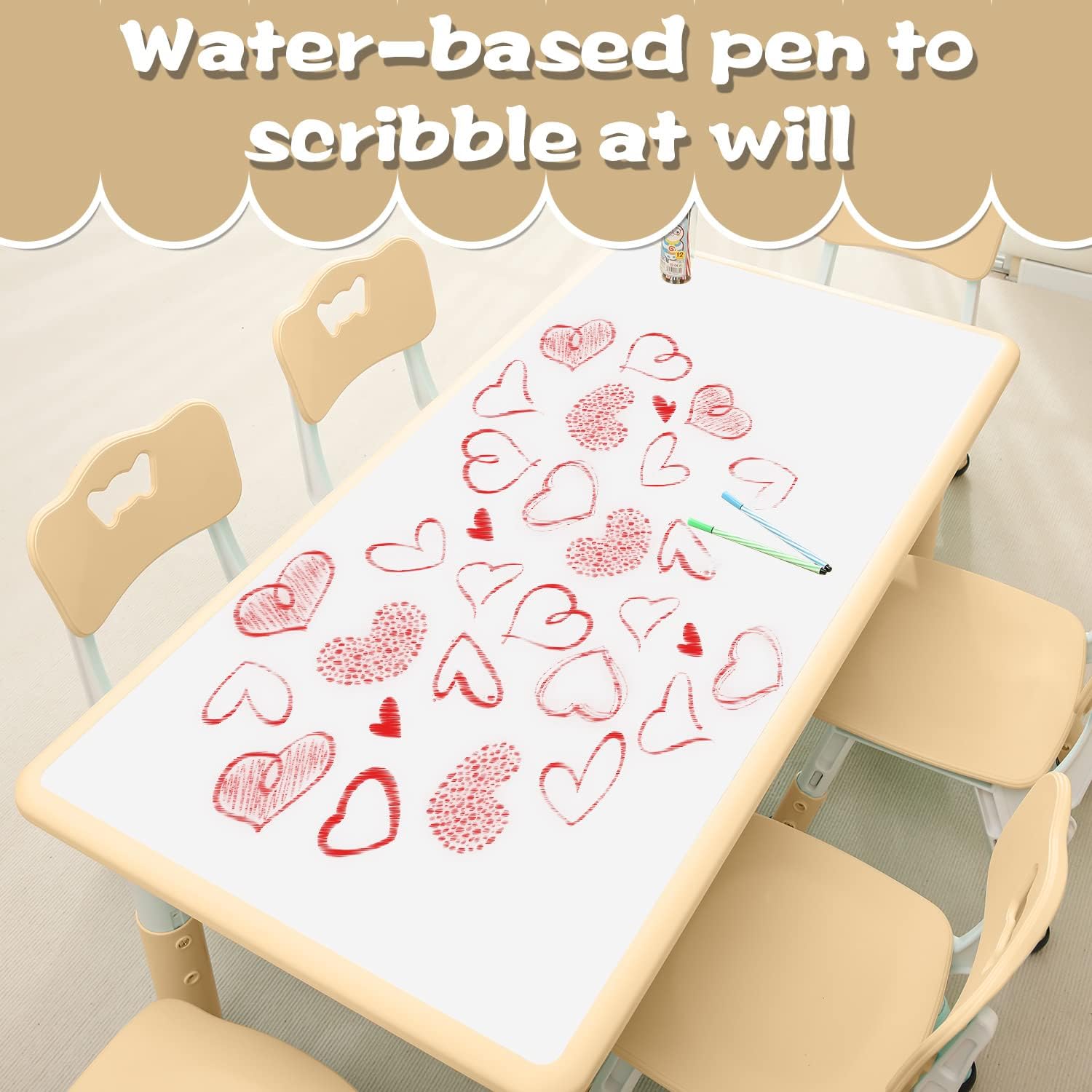 Children's Table and Chair Set Suitable for Boys and Girls Age 2-12 Height Adjustable Table top Can be Painted with 6 Seats Suitable for Family Learning Daily use (Wood Color)