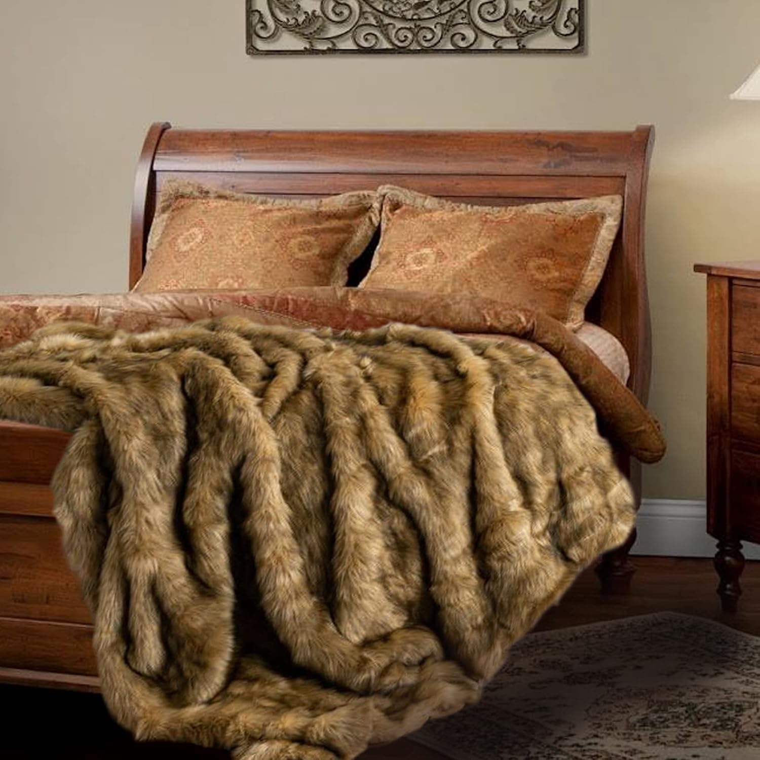 BATTILO HOME Golden Faux Fur Throw Blanket for Couch Sofa, Long Pile Fur Blankets and Throws, Elegant, Fluffy Thick Warm Heavyweight Fur Blanket Reversible to Plush Velvet, 50"x60"