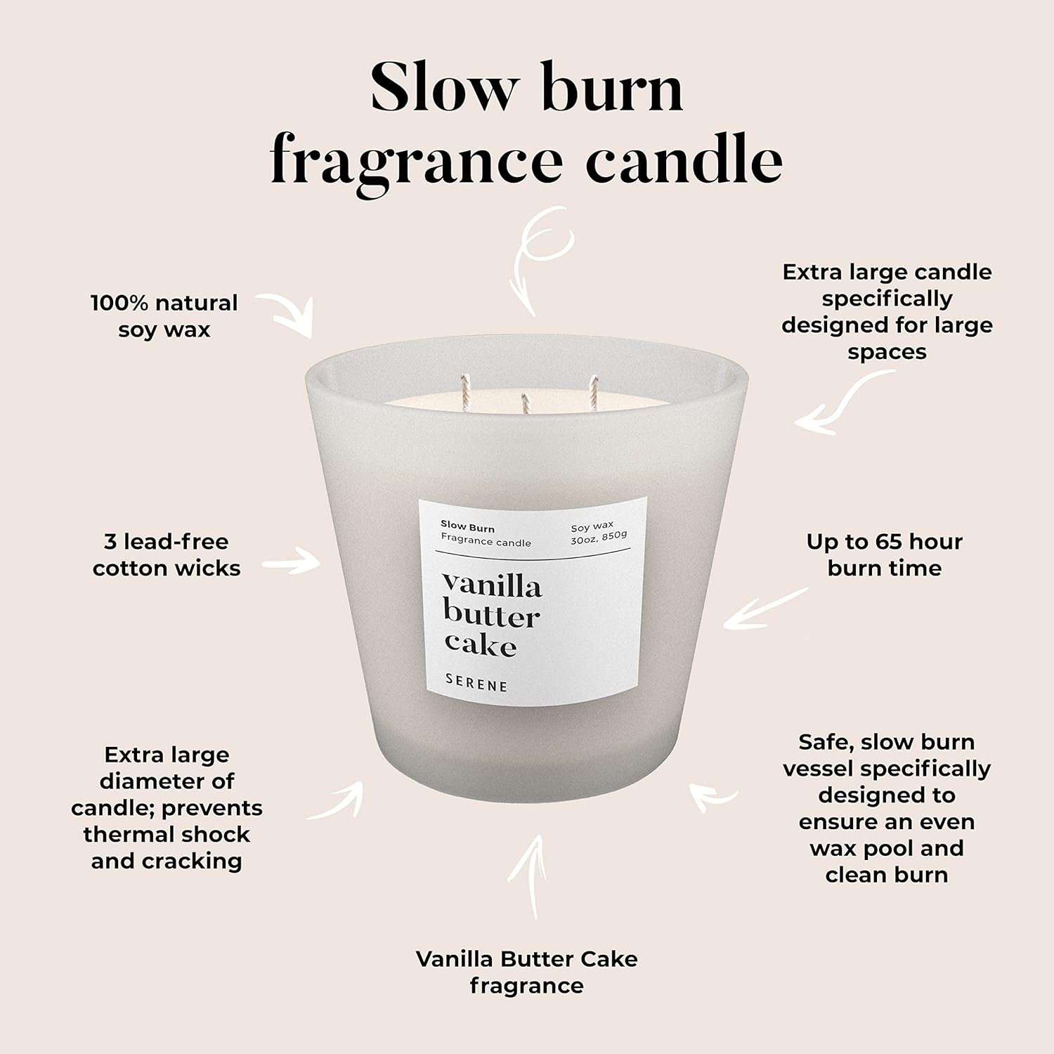 Hidden Label Large Scented Candle, Vanilla Butter Cake, 30oz 3 Wick Huge Candle, Serene Collection Slow Burn Natural Soy Candles for Home Scented