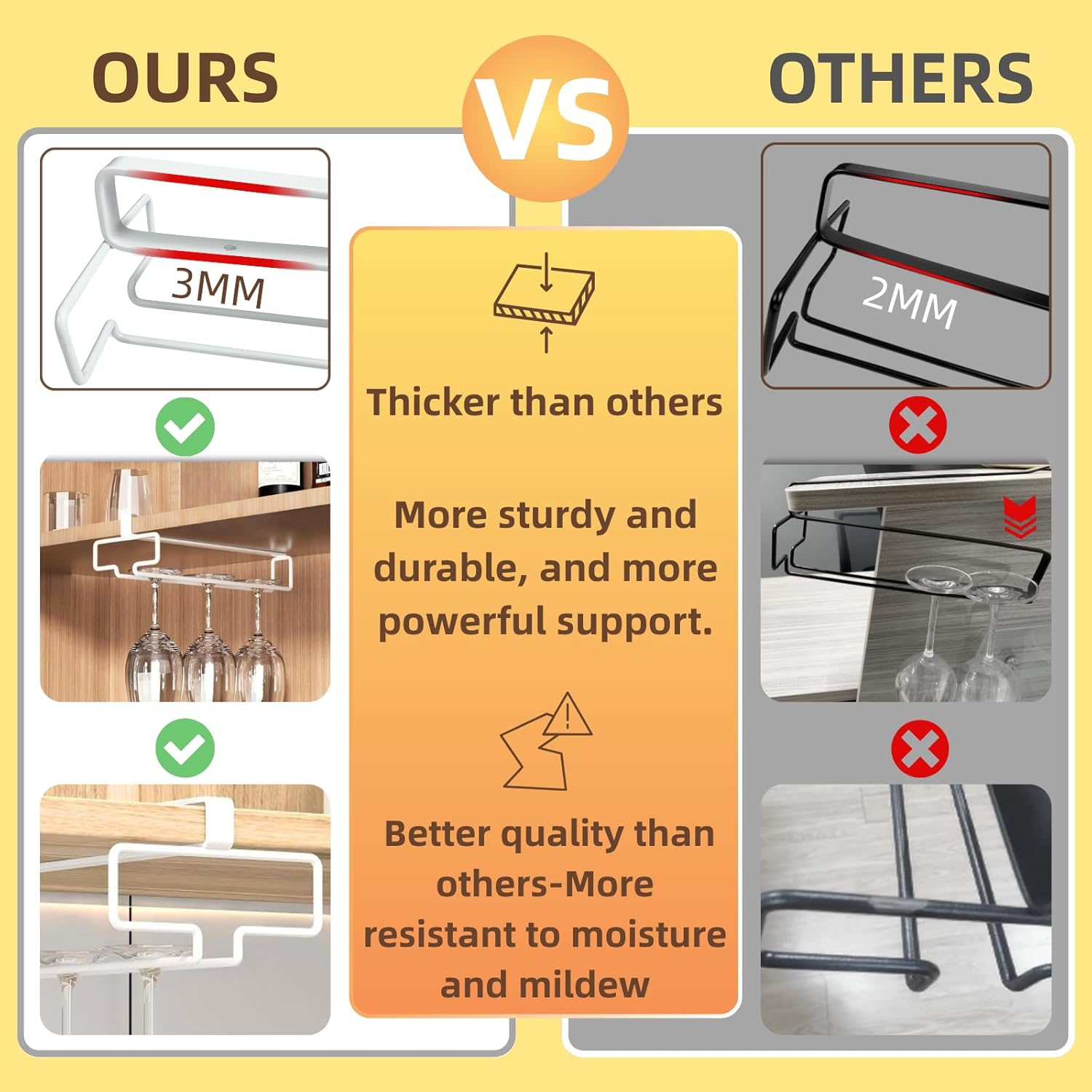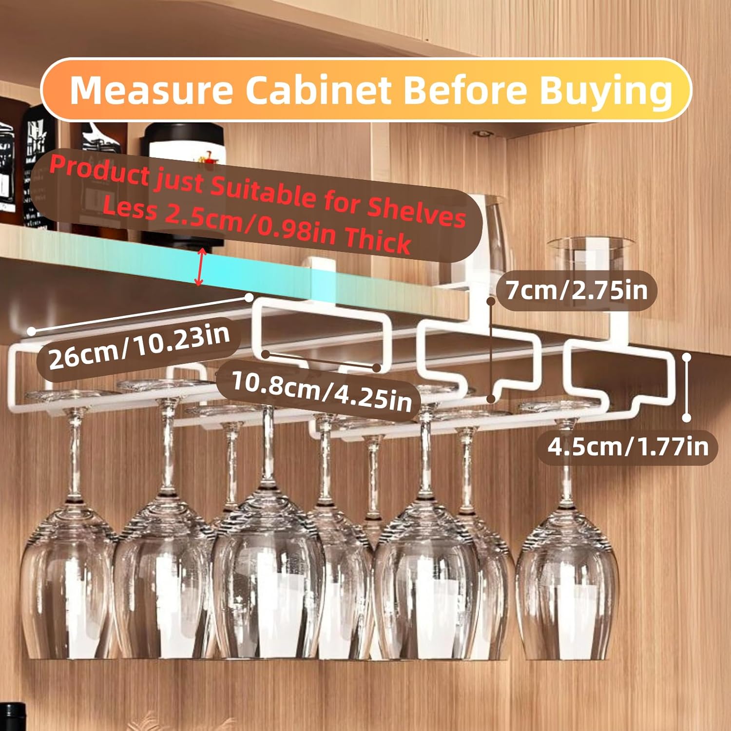 - PLEASE PAY ATTENTION:Please Measure The Thickness Of The Shelf Or Cabinet Board Before Purchase. This wine glass rack is only suitable for shelves less than 2.5 cm (0.98 in) thick. For cabinets or shelves with doors, its thickness may prevent the door from closing tightly. The best installation position is the location corresponding to the door handle, which can minimize the impact.
