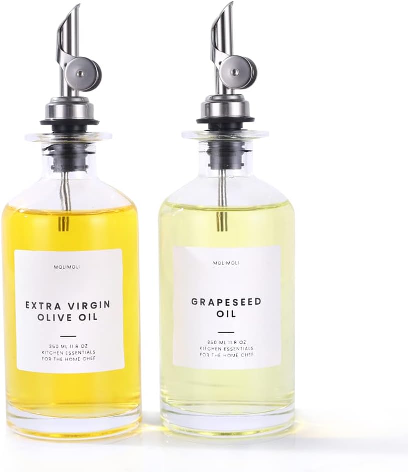 - Modern Kitchen Essential: Minimalism Inspired Cooking Oil Dispenser Bottle. This Set Includes Two High-quality 11.8 Oz (350 Ml) Glass Bottles, Two Silver Pourers, a funnel, and a 22 Label Set.