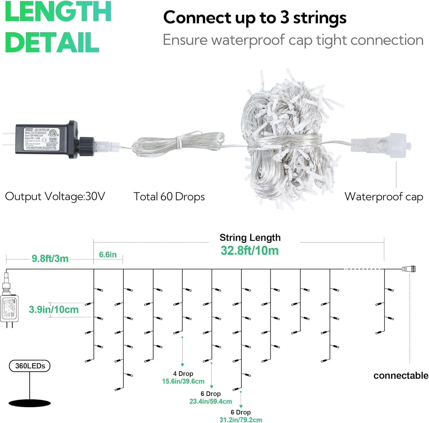 - ๐ใConnectable for Wide Useใ: Our icicle Christmas lights adopt 360L bright led bulbs,42.6ft/ 13m long in total with total 60 drops.Drop lengths 16''- 24''- 31''- 24'', number of light bulbs is 4, 6, 8, and 6 respectively. The outdoor string lights is extendable,can maximum connect with 3 sets.clear wire looks simple but dreamy.You can hang them on roof, hedge, fence, prom, patio, eave, handrail etc, creating romantic atmosphere for wedding,party,Valentine's Day,Christmas,New Year.