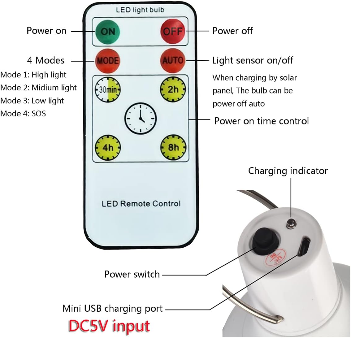 - Two Way Charge: The light bulb can be charged by the solar panel or DC 5V adaptor by USB cable, it can keep lighting for 4-6 hours after fully charged.LED lifespan is 50000H. When charging by solar panel: please put the solar panel outside under the sun and keep the solar panel facing the sunshine directly.At the same time connect the bulb with cord to the bulb for 5-8 hours, charging indicator is red when charging, full charged still red.(5-8V power adaptor for charging as well) .
