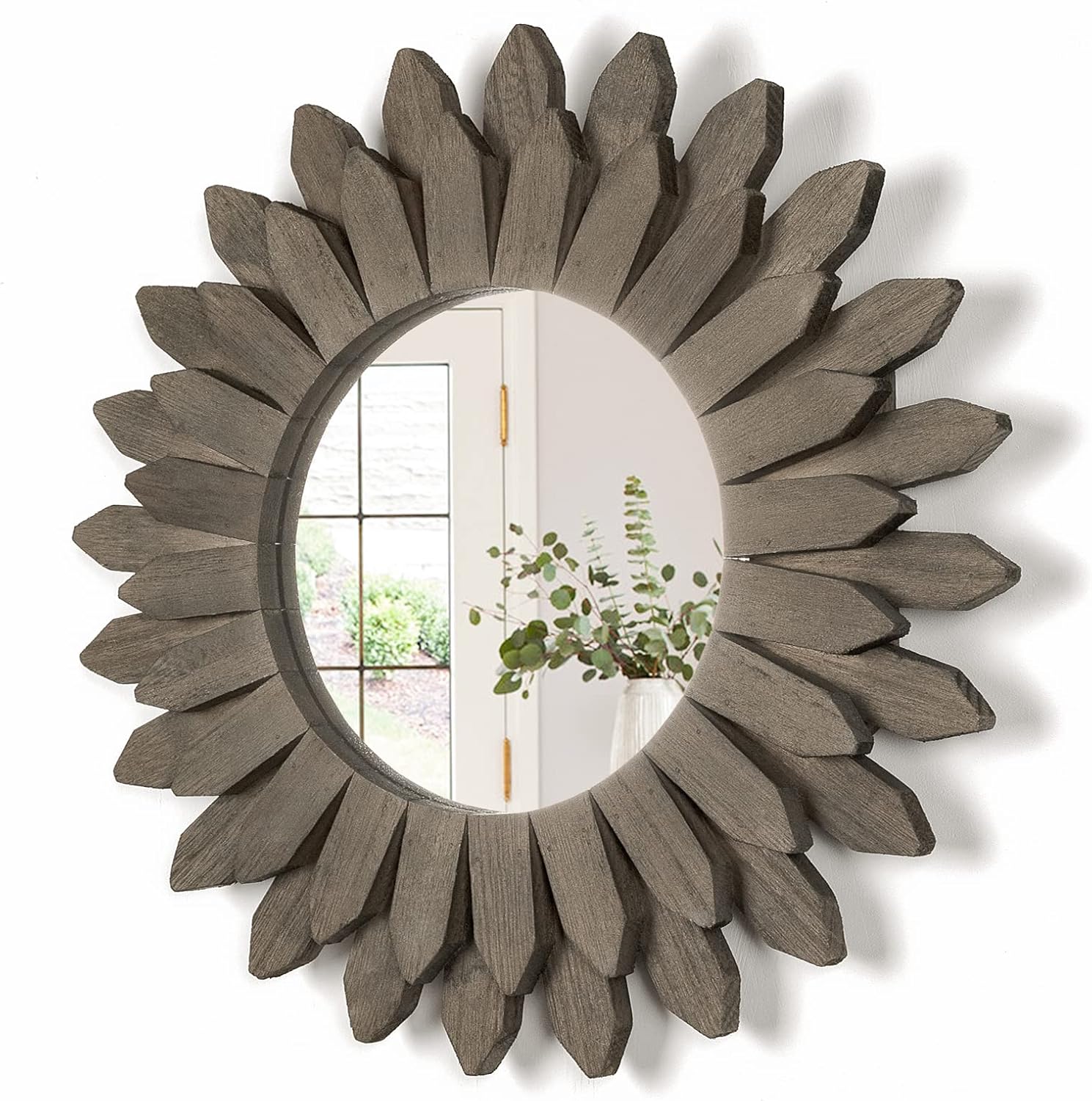 Honiway Farmhouse Wall Decor Mirror 12 inch Sunburst Boho Wood Mirror Rustic Home Decor Room Decoration for Bedroom Living Room Weathered Grey