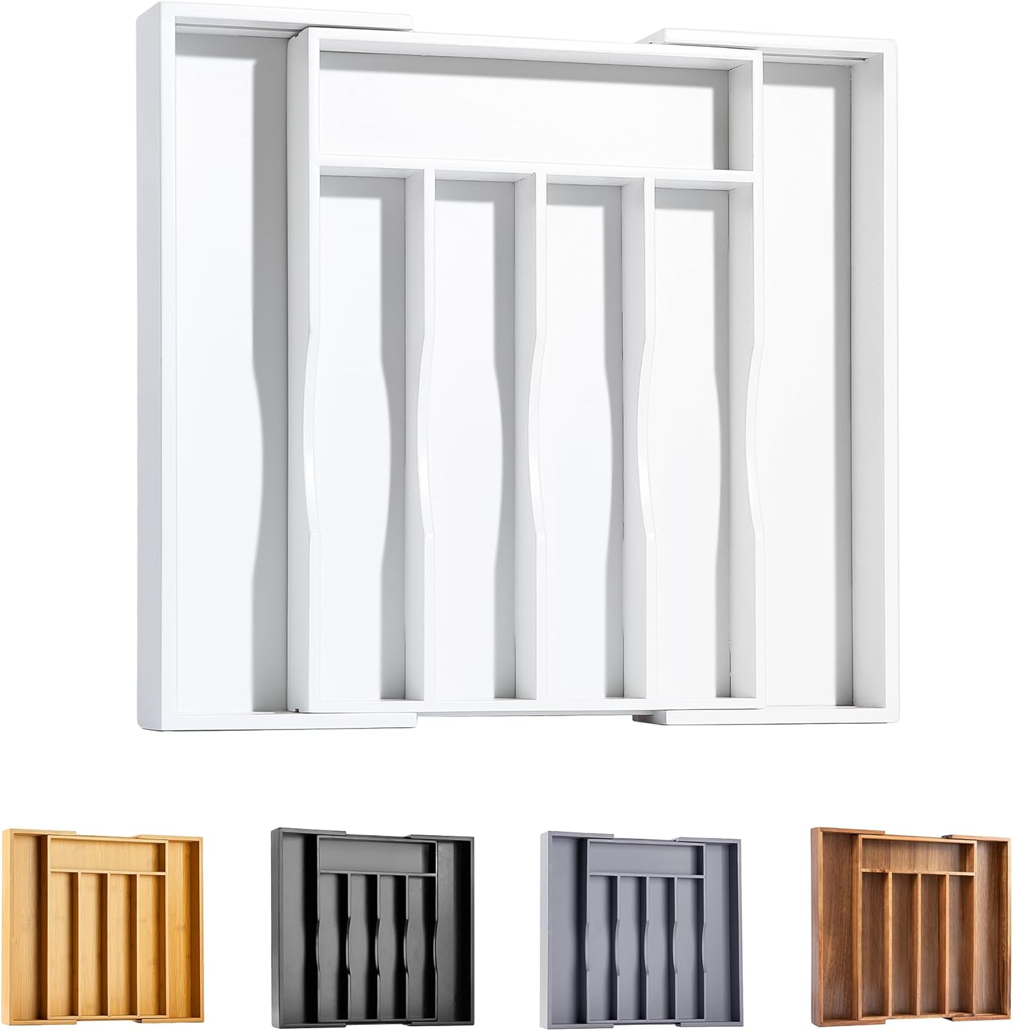 Bellsal White Silverware Organizer Kitchen Drawer Organizer Expandable Bamboo Utensil Holder Cutlery Tray for Kitchen Utensil and Flatware Bedroom Office