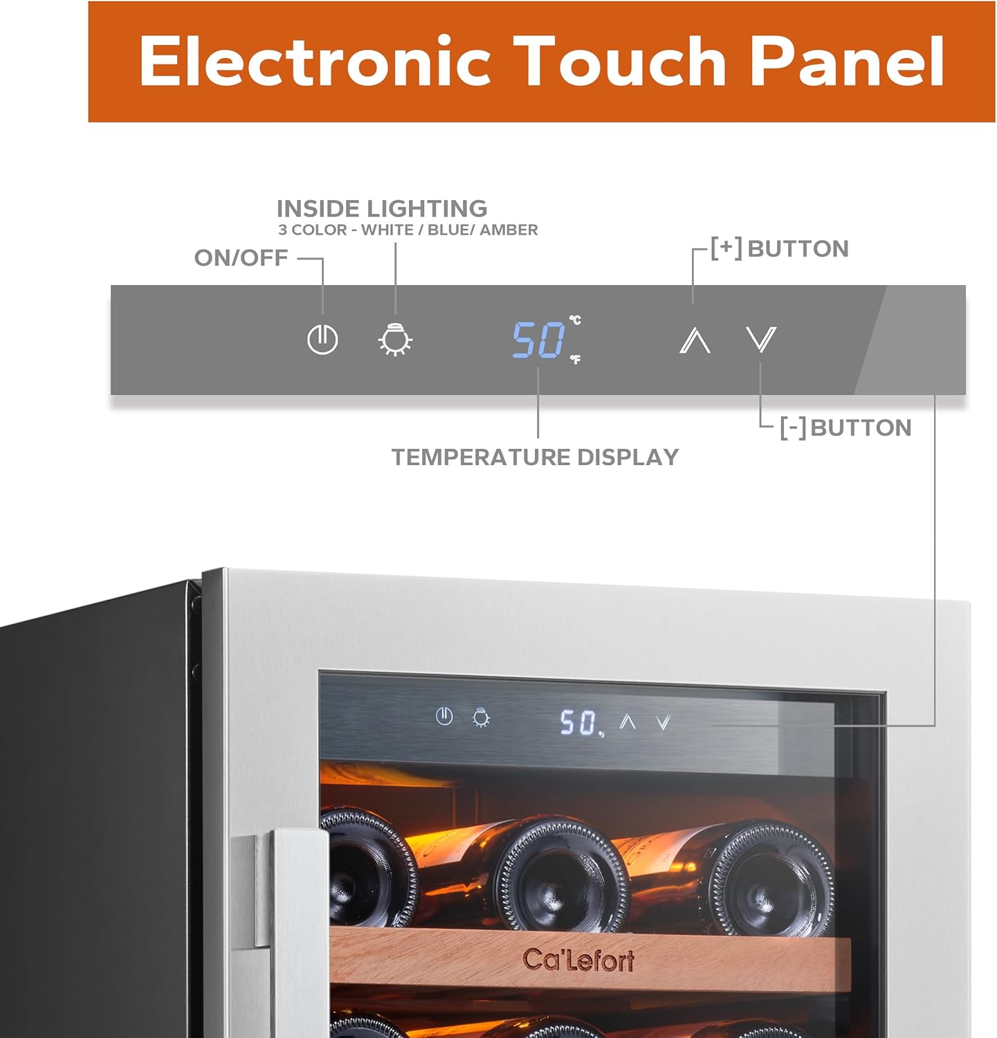 - 【Perfect companion for wine】Ca'Lefort Wine Fridge 3.00 cu.ft capacity holds at least 33 bottles of wine (standard 750ml). The minimum temperature is 40°F, with the smart digital panel, you can adjust the temperature accurately by 1°F. The hardness, eco-friendly and durable removable shelves (made of sapele wood) make it easy to access the red wines, and by adjusting the shelves, you can place different sizes of red wines. You can choose the amber/blue/white LED according to different moods.