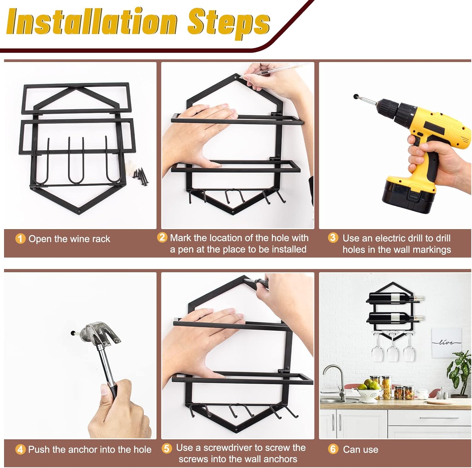 - γEasy to InstallγEnjoy quick and easy installation of your wall wine bottle and glass holder with the easy to use mounting hardware included, which can decorate any wall space and has an important decorative effect.
