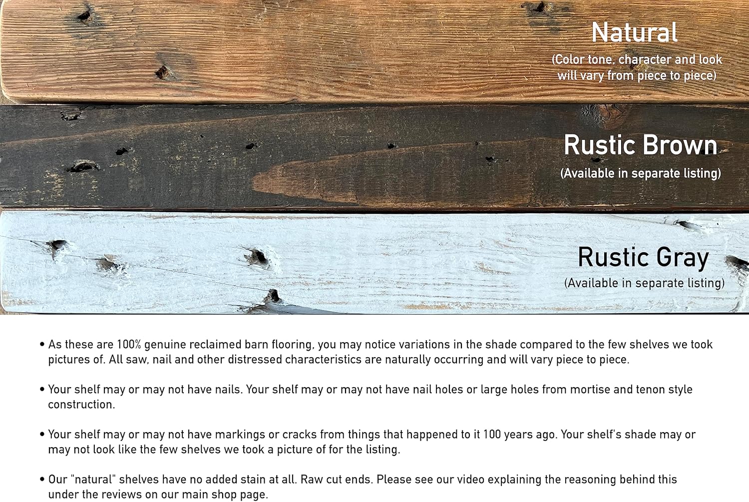 - Please note: The coloring of these shelves is Natural. They are not stained or finished in any way. All coloring is naturally occurring from decades in a working barn. When shelves are cut to size, the ends may be lighter or a different color, as the inside of the shelf has not been exposed to the elements of the barn. Please be sure to look at all of the listing pictures.