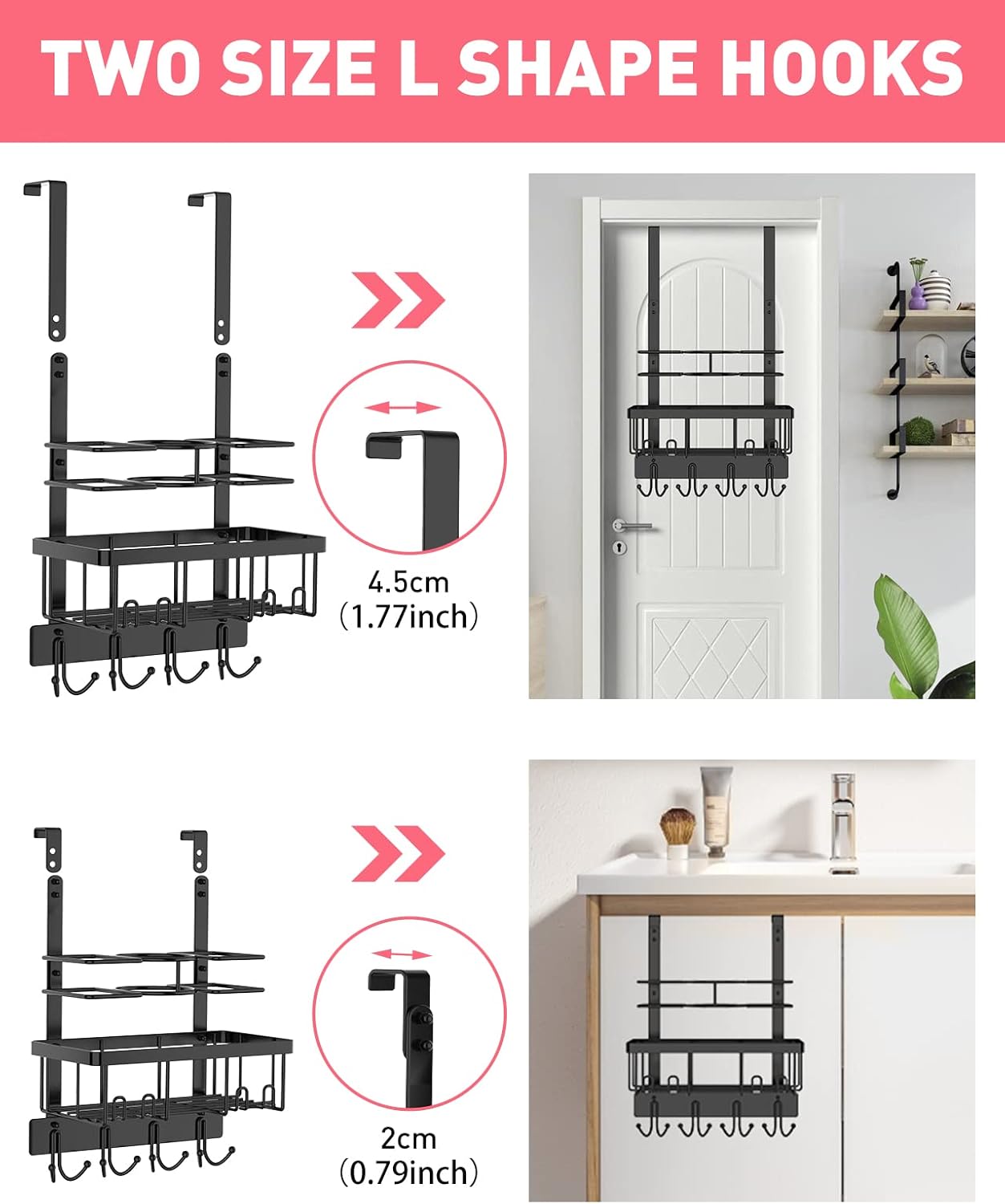 - MUTIPLE USES : Hanging on the bathroom/cabinet door or Wall Mount. Come with two size L shape hang hook. The short hang hook fits over cabinet doors up to 0.79 inches /2 cm thick. The long hang hook fits over bedroom/bathroom doors up to 1.77 inches /4.5 cm thick. Easily installs on bedroom/bathroom or hang over the shower/cabinet door with the included hardware.