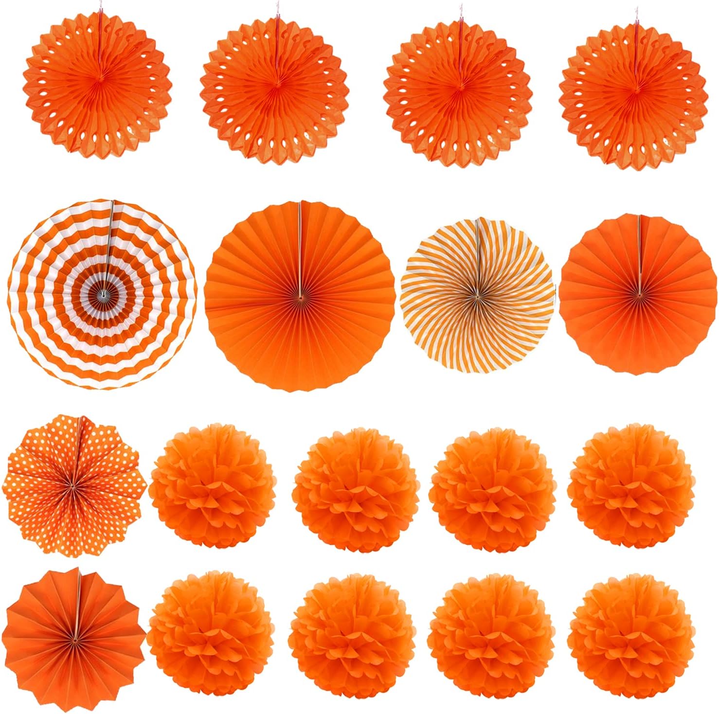 - Includes: 1 x 6.5ft Triangular pennants, 8 x 10inch/25cm Paper pompoms, 6 x 10inch/25cm Paper fans, 4 x Paper hollow fans, 2 x 6.5ft Circle Paper Garland. ( Color: Orange and White)