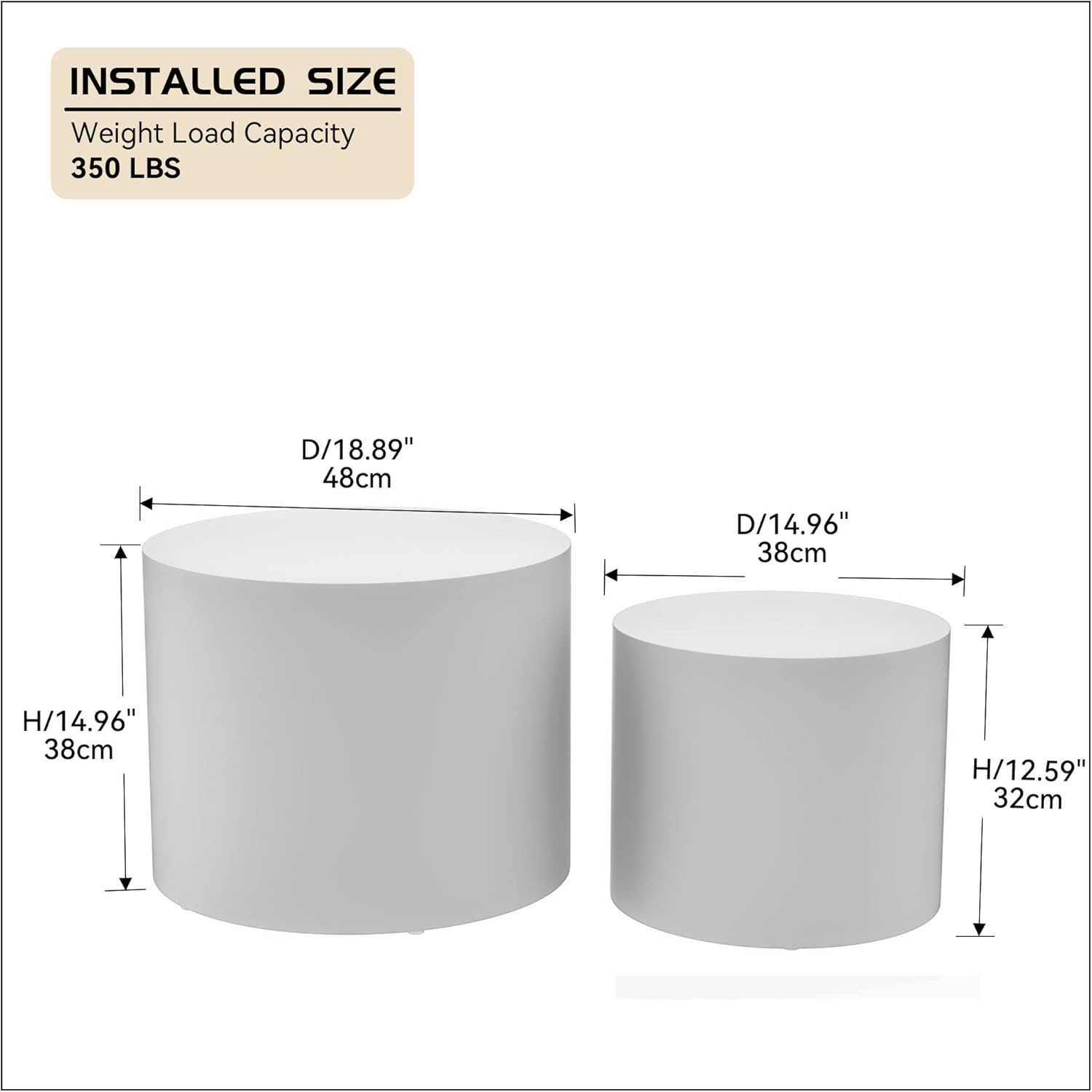 - ☕ The nesting sets consists of one Coffee table (Φ 18.9 x H 14.9 inch) and one Side table (Ø 14.9 x H 12.5 inch) can be arranged in multiple ways.You could slide the small one under the big one when you wanted more space. You can combine them as you like, make your room tidy and neat.