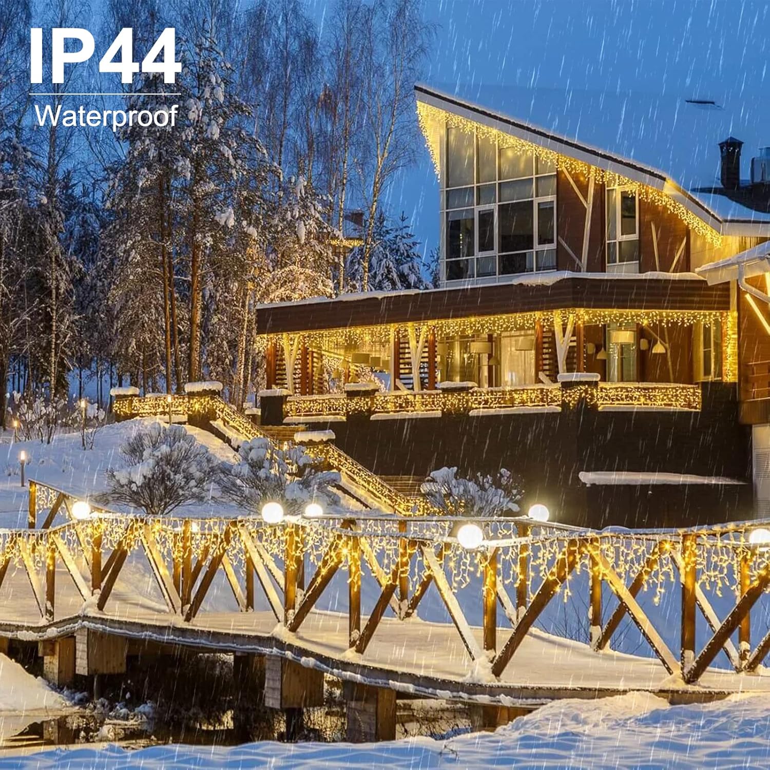 - γSafe Use & Waterproof for outdoor useγThis Christmas icicle lights outdoor with 30 volts operating and 0.3 ampere, will not overheat even after working for a long time and safe to touch. In addition, IP44 waterproof, it makes the icicle lights can be used in outside like trees, roof, front door, eave, etc. Please kindly note: The AC adapter should be protected from rain when using outdoor.