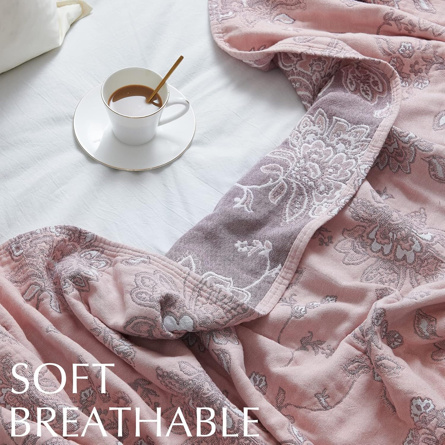 jinchan Boho 100% Cotton Muslin Twin Size 60x80 Inches Blanket Lightweight 4-Layer Quilted Soft Pink Red Floral Throw Blanket Reversible Comfy Flower Breathable All Seasons Couch Bedroom Decor