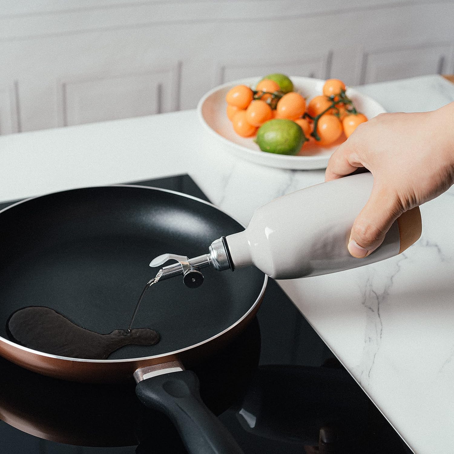 Olive Oil Dispenser Bottle Stoneware Ceramic, Cruet Protects to Reduce Oxidation, Suitable For Storage Of Oil, Vinegar, Coffee Syrups & Other Liquids - Stainless Steel Spout 14Oz