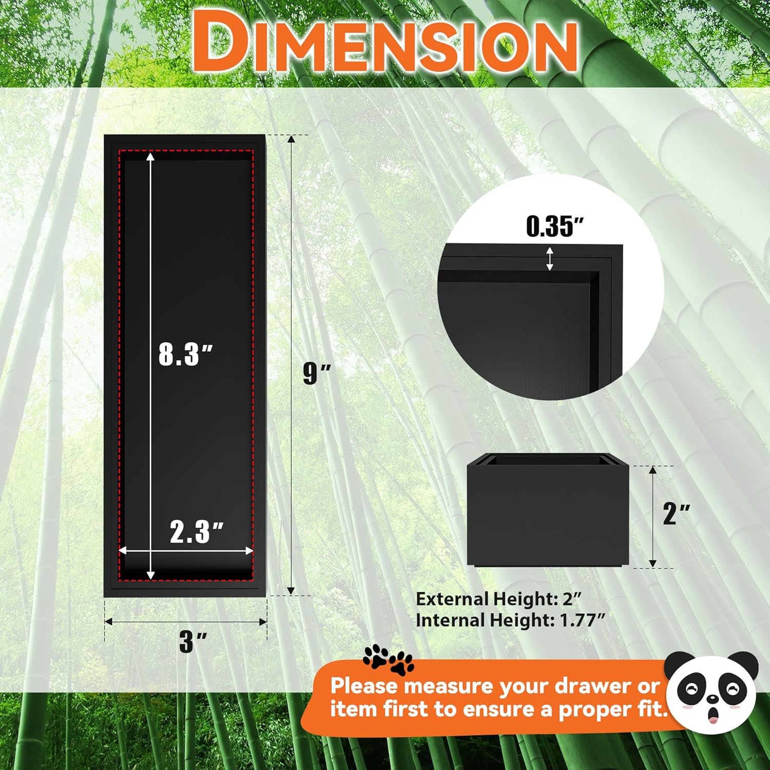 - Each bamboo drawer organizer measures: external size: 9" L x 3" W x 2" H; internal size: 8.3" L x 2.3" W x 1.77" H. Please check the size before purchasing