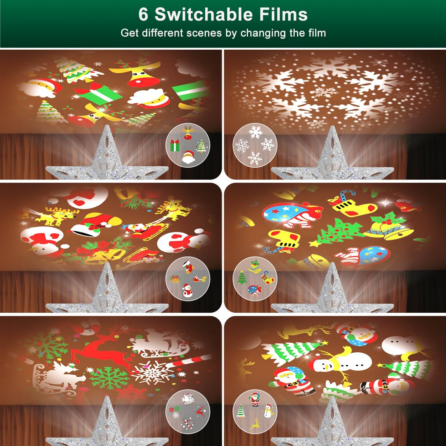 - Magic 3D Rotating Projector: Sliver christmas tree star topper with 3D hollow design, classic pentagram look design with glitter gold powder slight fall of glitter is normal. Decorate the top of your Christmas tree with projected patterns swirling and dancing on the ceiling to make your Christmas impressive