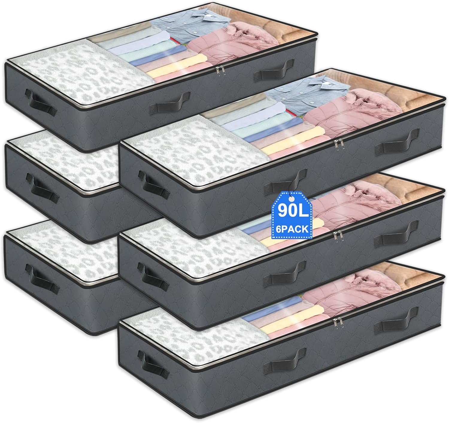 6 Pack Under Bed Storage Containers, 90L Collapsible Closet Organizers and Storage Bins, Underbed Storage Bags for Wrapping Paper, Blanket, Towels, Clothes, Comforter, Sweaters, Linen Sheets