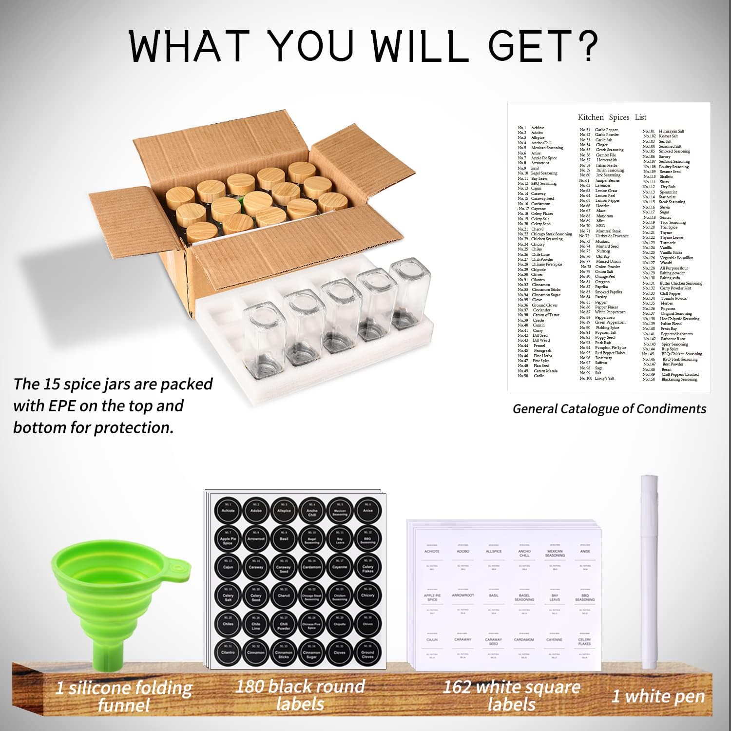 - Complete 4 oz Spice Jars Set: This set of spice jars contains: 36 4oz glass spice jars with bamboo lids, 1 complete list of spices, 180 black round labels, 162 white square labels, 1 white pen , 1 silicone folding funnel for refilling