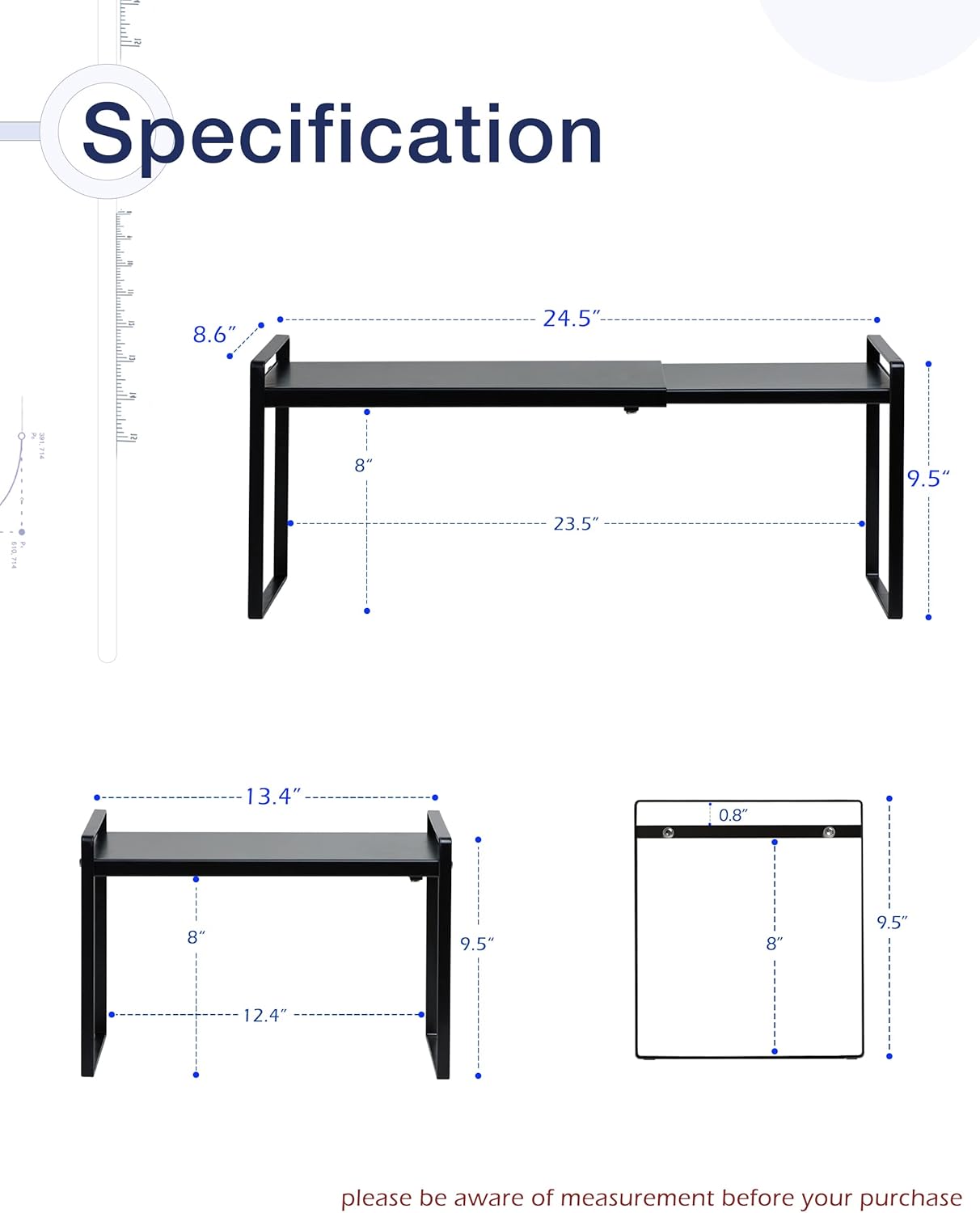 - EXPANDABLE: You may expand the width of this freestanding cabinet shelf to your desires. It can easily vary from 13.4 inches to 24.5 inches in width depending on how you want to organize your space. Specification: 8.6’’D * 13.4-24.5’’W * 9.5’’H
