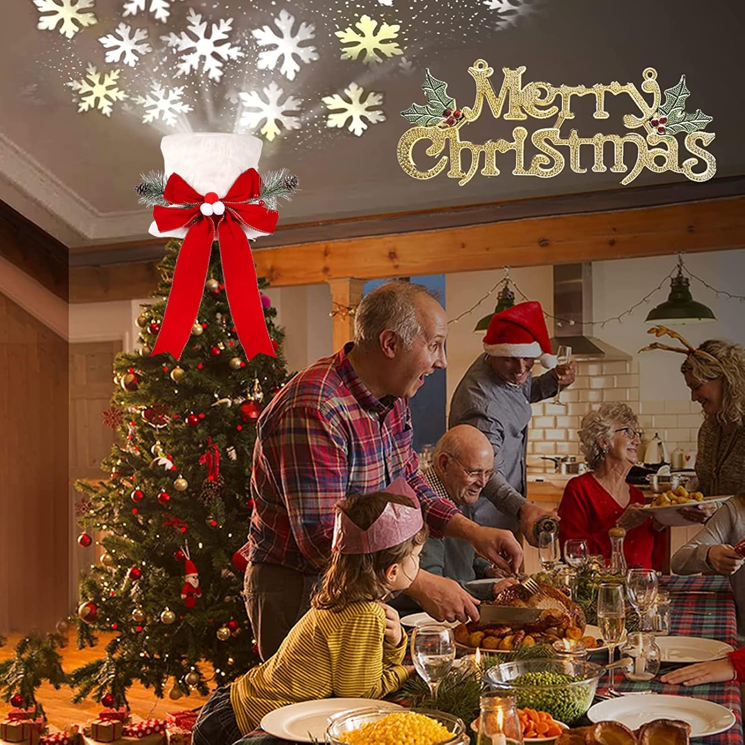 Christmas Tree Topper Hat with 3D LED Rotating Snowflake Projector, White Plush Tree Toppers Red Bow Decorations for Christmas Tree Holiday Winter Party Indoor Decorations