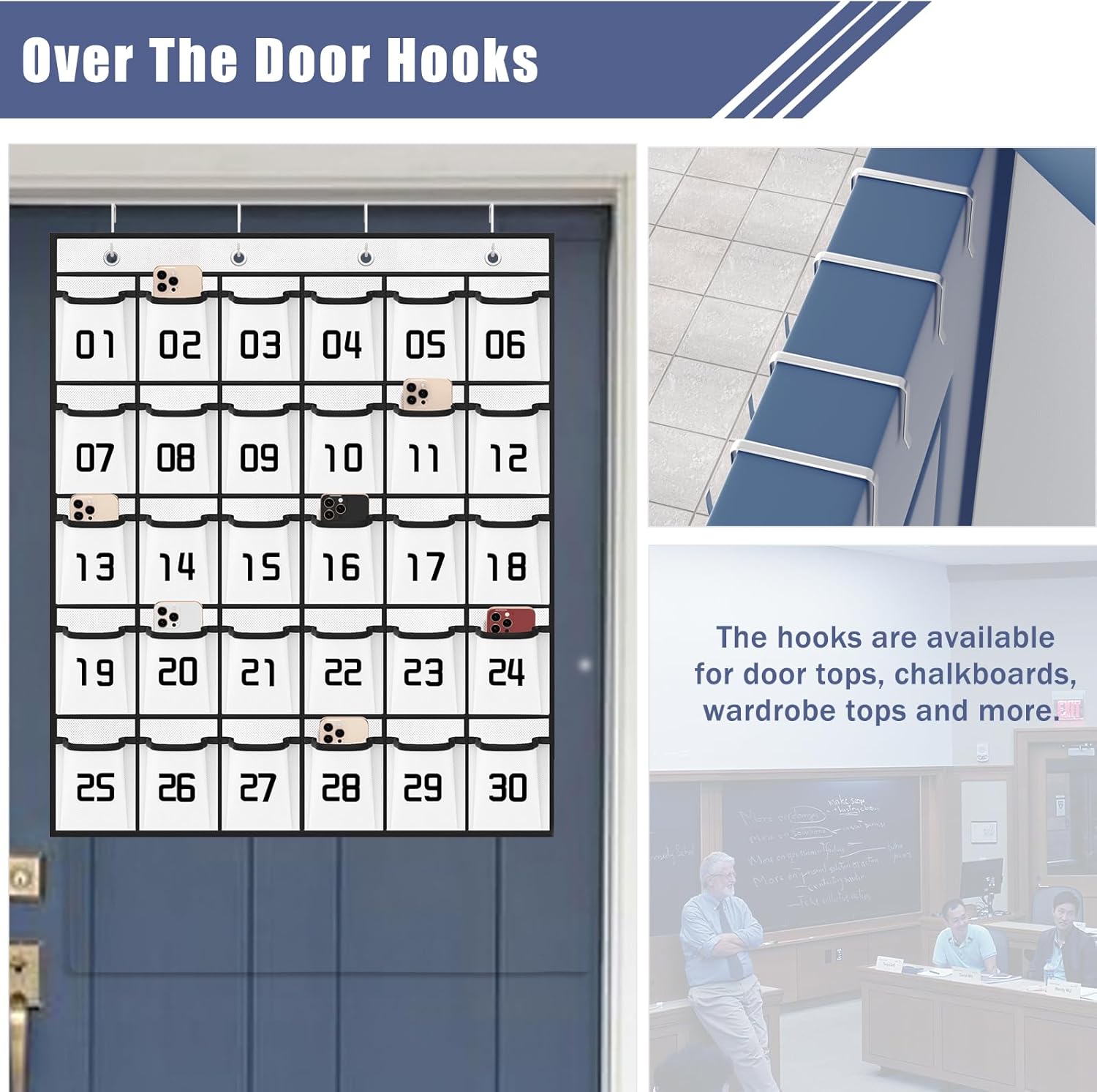 - γ4 Metal Hooks for Classroom Pocket Chartγ Calculator Phone pouch fit the top of whiteboard or over the door as thick as 1.3"-2", hanging organizer with pockets supports the weight of 30 phones (about 20 lb), easy to install and close the door.