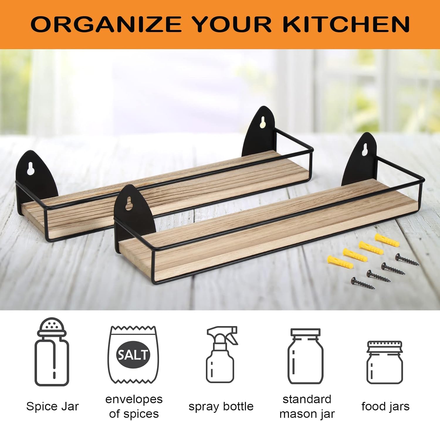 - [Wall Mount Spice Rack]: Each rack can hold 16pcs 4oz spice jar (1.75”), 5pcs 9oz small food storage containers (2.55"), 5pcs oz spice jars (2.56"), 3pcs envelopes of spices (3.3"x5.5"). It can also hold spray bottles, food jars, essential oil bottles, books, quart jars, standard mason jars, standard seasoning jars (not recommend for heavy items such as soup cans).