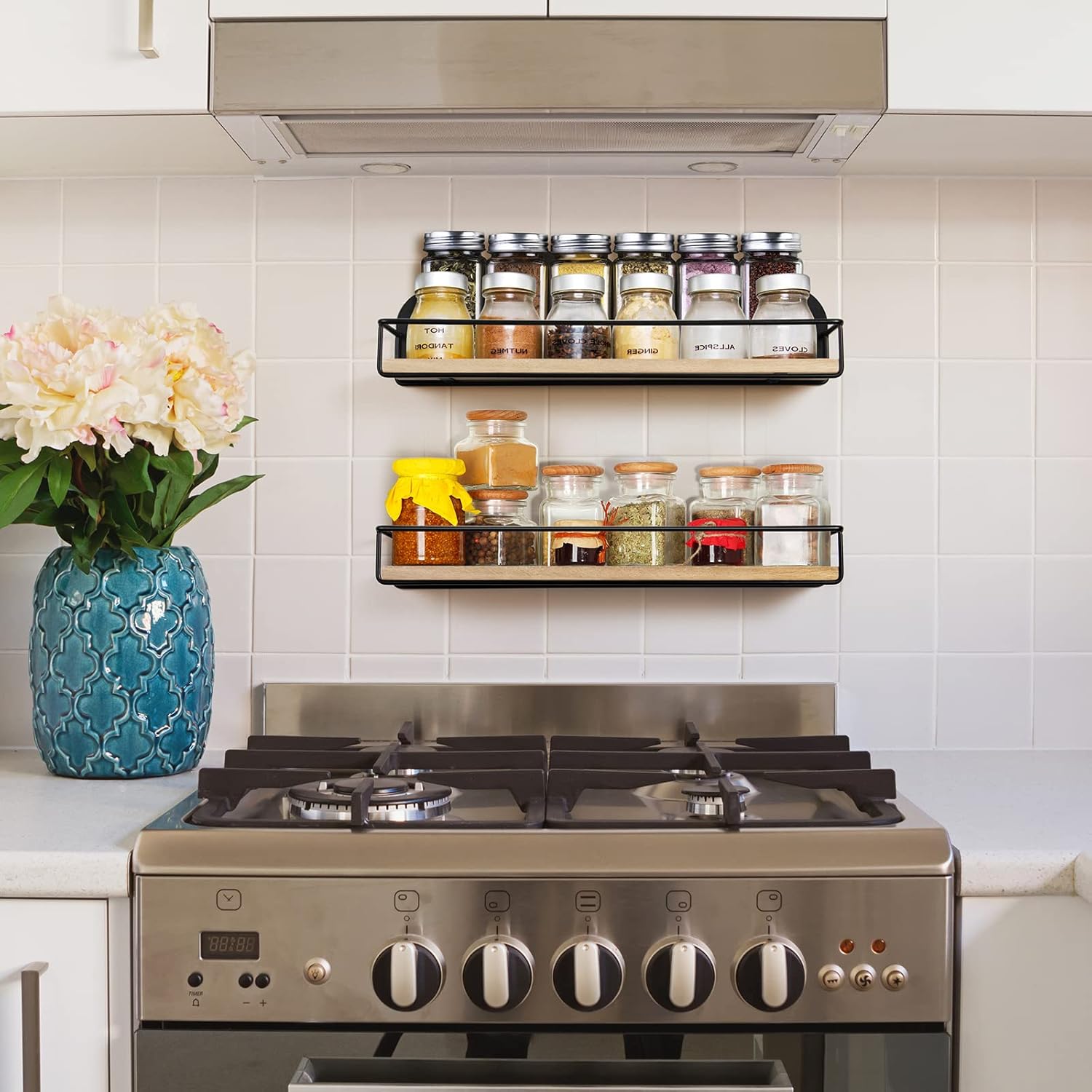 - [Hanging Spice Rack]: This rack can be mounted inside a cupboard door (requires small screws, not included), under the cabinet, on a wall, or it can just rest on the counter or over the stove. Highly recommend for a kitchen wall.