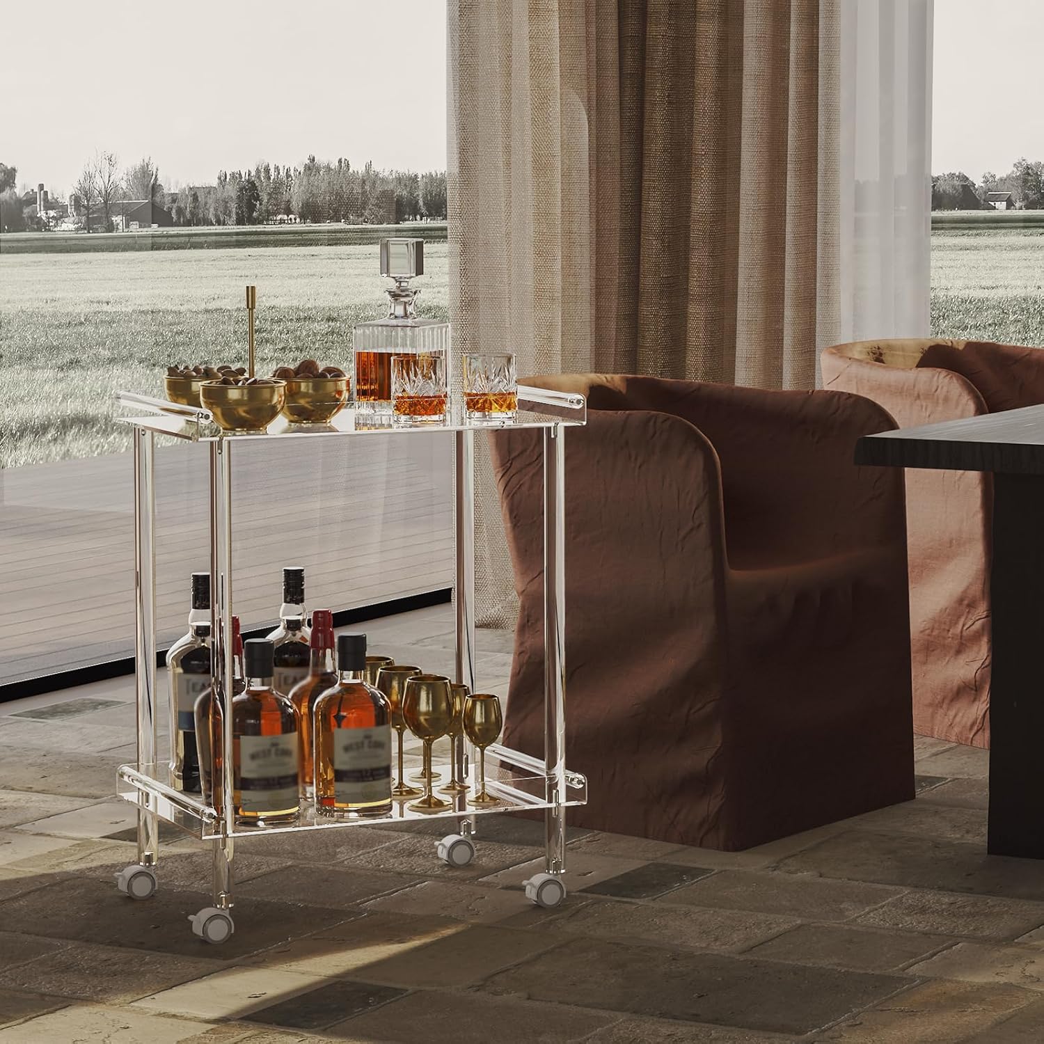 HMYHUM Acrylic Bar Cart, Rolling Serving Cart with 4 Lockable Wheels for The Home Bar, Kitchen, Living Room, Modern, 2-Tier, 23.6" L x 15" W x 30" H, Clear